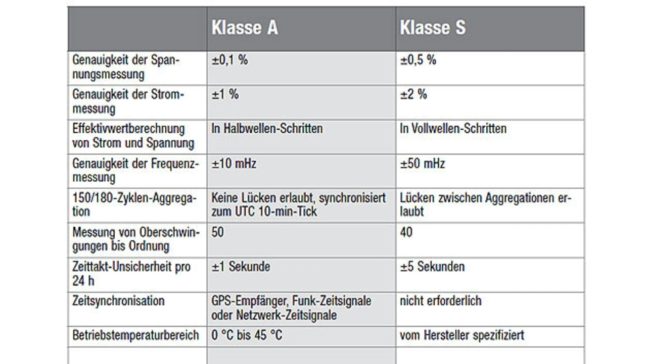 Die Instrumente müssen vielmehr auch Anforderungen beispielsweise an die Zeitsynchronisation, die Qualität der Messsonden, die Kalibrierzeitspannen, die Temperaturbereiche usw. erfüllen. In der Tabelle sind Anforderungen aufgelistet, die Messinstrumente für die Einordnung in die jeweilige Klasse zu erfüllen haben.