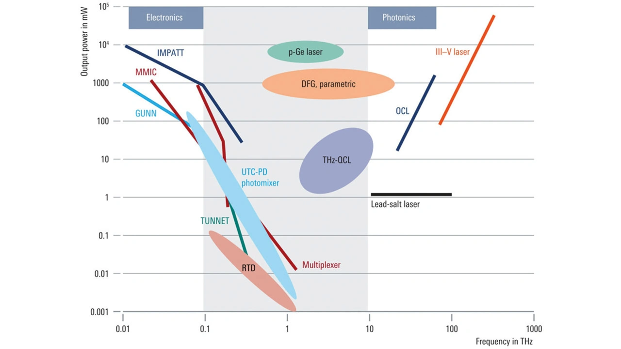 Die Problematik wird deutlich, wenn man die THz-Abstrahlleistung in Abhängigkeit von der Frequenz für unterschiedliche elektronische und photonische Geräte betrachtet. Im THz-Frequenzspektrum von 0,1 THz bis 10 THz ist in Bild 1 ein Leistungsabfall erkennbar – die sogenannte THz-Lücke.