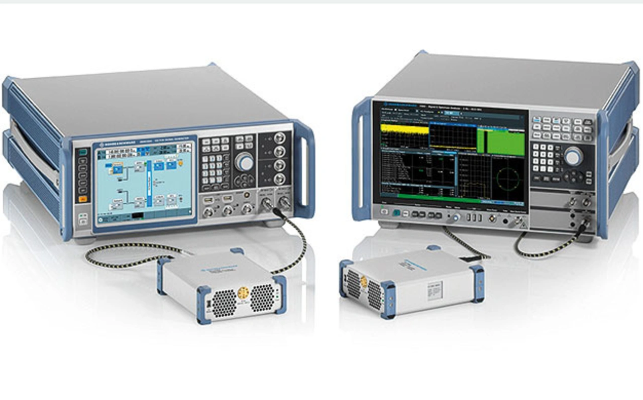 Einer der Schwerpunkte der 6G-Forschung liegt auf dem D-Band (110 bis 170 GHz), weil dieser Frequenzbereich wesentlich größere Bandbreiten von mehreren GHz in Aussicht stellt, die extrem hohe Datenraten versprechen. Bild 4 zeigt einen typischen Test- und Messaufbau zur Signalerzeugung und -analyse zur Unterstützung der Forschung an Komponenten und Transceivern in diesem Frequenzbereich. Dabei wird das Sende-Frontend R&S FE170ST eingesetzt, das die modulierten Signale (z. B. potenzielle 6G-Signalformen) vom Vektorsignalgenerator R&S SMW200A in den Frequenzbereich von 110 bis 170 GHz hochkonvertiert. Als Gegenstück dient das Empfangs-Frontend R&S FE170SR, das die Signale herunterkonvertiert und die Zwischenfrequenz (ZF) an den Signal- und Spektrumanalysator R&S FSW übermittelt. Das demodulierte Signal zeigt eine hervorragende EVM-Performance, die das extrem niedrige Phasenrauschen des erzeugten Signals unterstreicht.