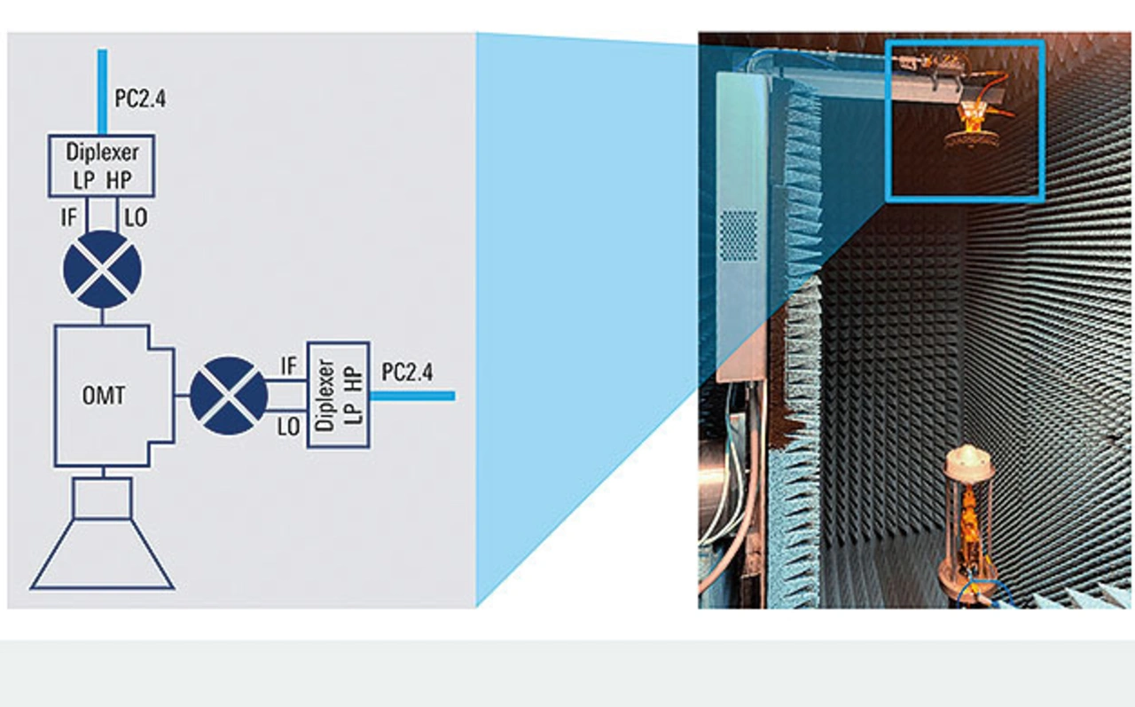 Das Blockdiagramm in Bild 5 stellt das Konzept der Messsonde dar. Ein Orthomode Transducer (OMT) ist an eine quadratische 20-dBi-Hornantenne angeschlossen, die eine 3-dB-Strahlbreite von 16° und eine Kreuzpolarisationsisolation von 25 dB über den gesamten D-Band-Frequenzbereich aufweist. Die Anordnung arbeitet reziprok und kann zwei orthogonal polarisierte Felder senden/empfangen, wenn der Prüfling auf Empfangen (RX) bzw. Senden (TX) eingestellt ist. Die Ab- oder Aufwärtskonvertierung erfolgt direkt an der Sonde, wodurch Kabelverluste bei HF-Frequenzen ausgeschlossen werden. Beide Polarisationen können gleichzeitig gemessen werden.