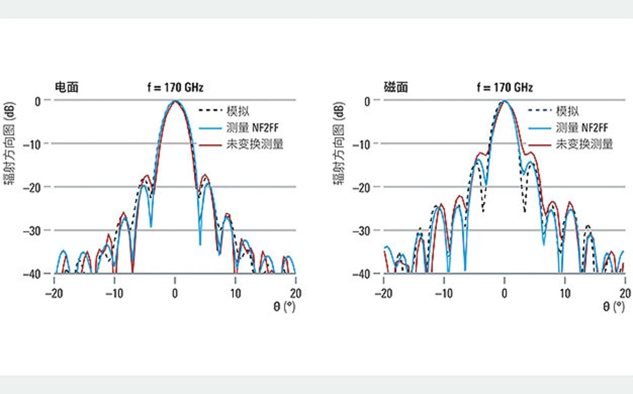 Die Ergebnisse in Bild 6 zeigen eine ausgezeichnete Übereinstimmung zwischen den DUT-Vollwellensimulationen und den Messungen. Das unterstreicht die hohe Genauigkeit des Messsystems und der eingesetzten Messtechnik in Verbindung mit dem neuen Sondendesign. Die phasenkohärente Datenerfassung wie die Nahfeld-Fernfeld-Transformation (NF2FF) lässt sich bei passiven Antennenmessungen erfolgreich anwenden. Bemerkenswerterweise zeigen die untransformierten Messergebnisse in Rot, dass der Hauptstrahl des Strahlungsmusters bereits nahe am asymptotischen Fernfeldverhalten ist.