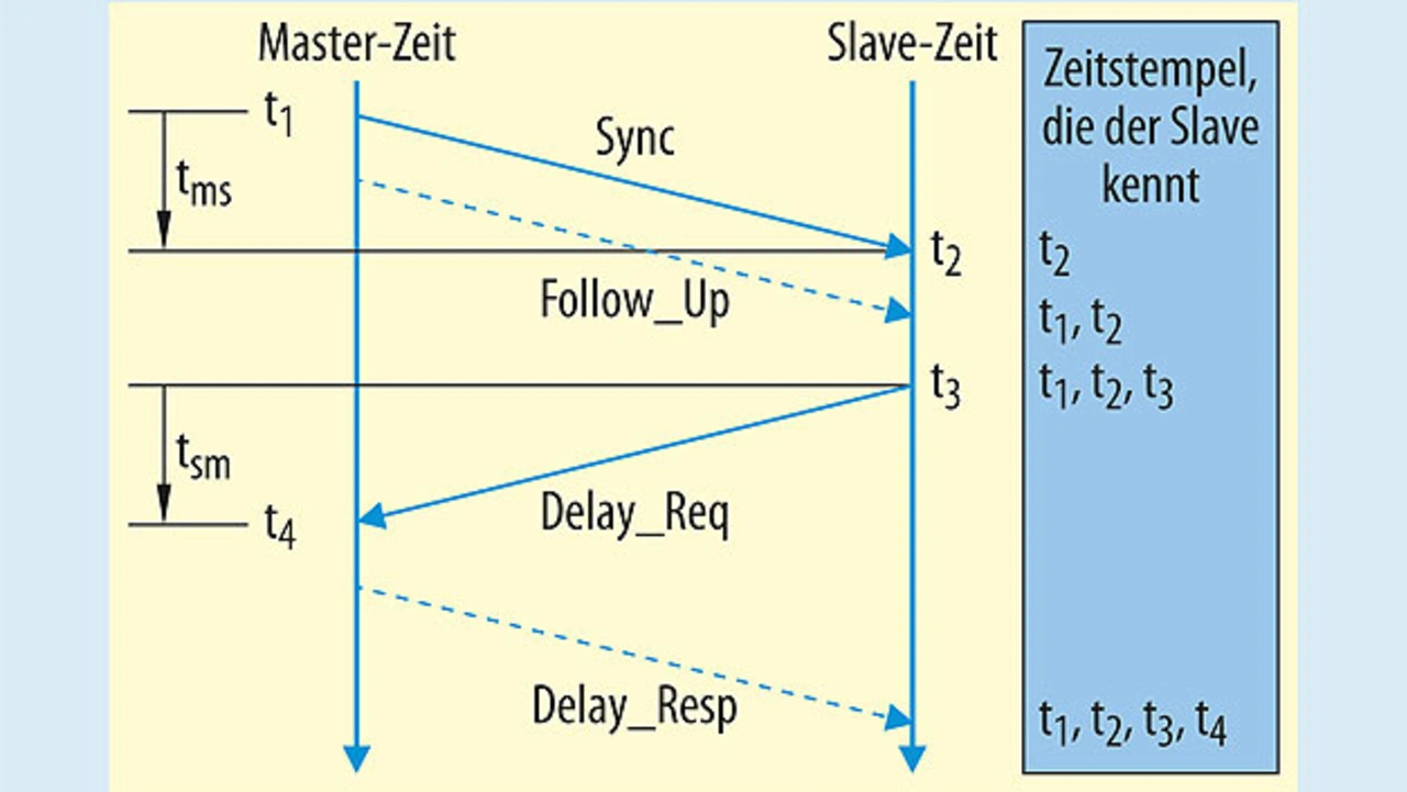 Bild 2 zeigt den genauen Ablauf der PTP-Kommunikation und den damit verbundenen Austausch der benötigten Zeitstempel. Die Erfassung der Zeitstempel t1 und t4 geschieht auf der Seite des Master und wird mit den Nachrichten an die Slaves gesendet. Damit dieser Knoten zum Schluss seine vier Zeitstempel besitzt, werden t2 und t3 Slave-seitig beim Empfang der Master-Nachrichten erstellt.