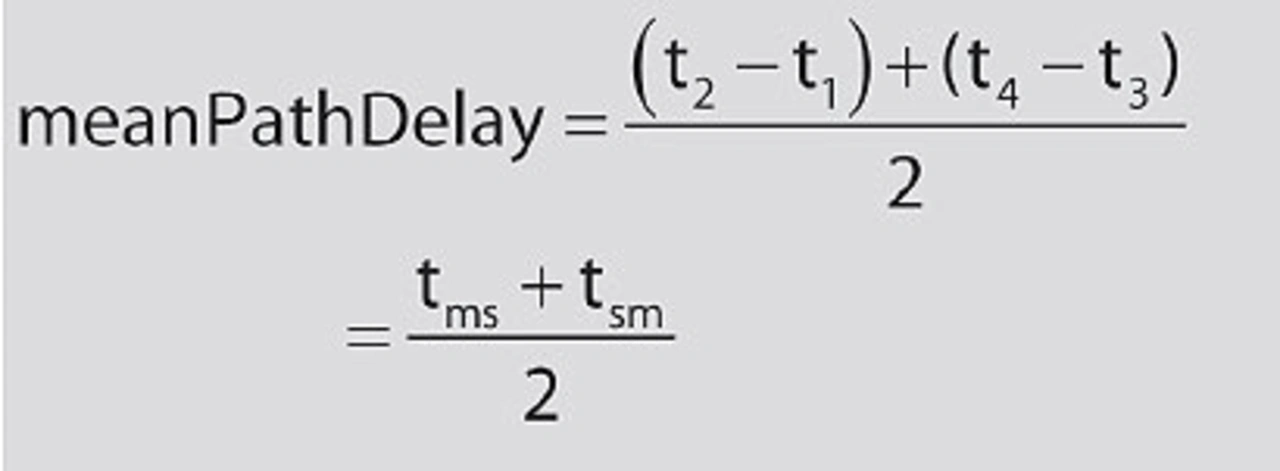 Mit Hilfe der Zeiten t1, t2, t3 und t4 kann nach dem Austausch der Nachrichten das „meanPathDelay“ berechnet werden. Das „meanPathDelay“ gibt an, wie lange eine Message für die Übertragung im Netzwerk gebraucht hat, also die Verzögerung. Wie an der Formel zu sehen ist, geht IEEE 1588 davon aus, dass die Latenzzeit im Netzwerk für Senden und Empfangen identisch ist: Somit dient das meanPathDelay zur Laufzeitkorrektur im Netzwerk für die Berechnung des eigenen Zeit-Offset.