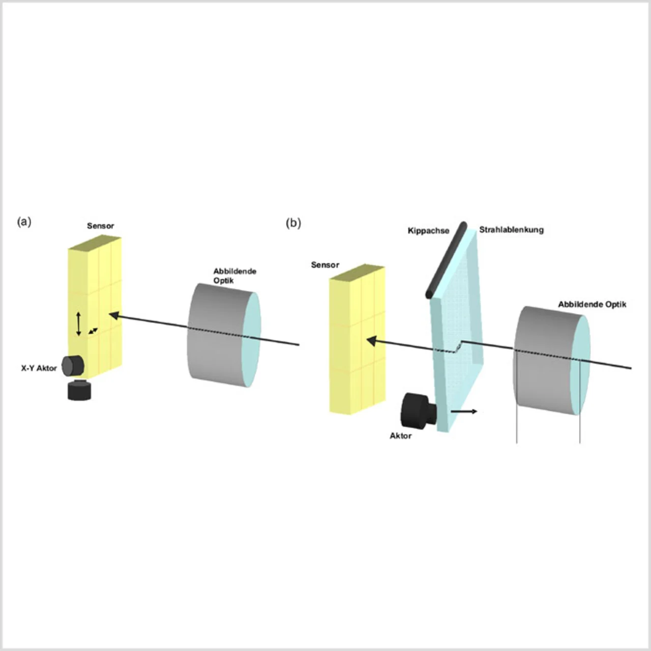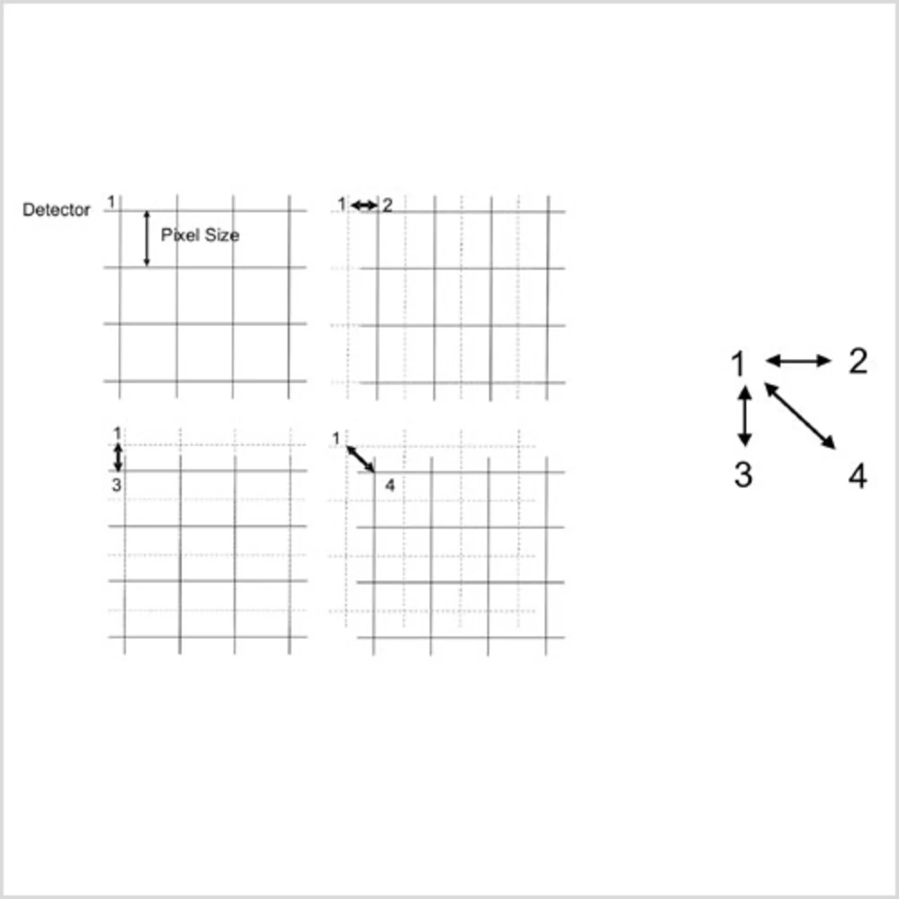 Beim sogenannten Pixel-Sub-Stepping wird das Aufnahmefeld mit definierter Frequenz auf vorgegebenen Bahnen bewegt (Bild 1). Durch dieses »Dithering« (»Zappeln« beziehungsweise »Hin- und Herschwanken«), dessen Verfahrweg unterhalb der Pixelgröße liegt, wird ein Pixel mehrmals auf dem Aufnahmefeld belichtet (Bild 2), es entsteht also quasi ein virtueller »Pixel-Vervielfacher« durch den sich die Auflösung verbessern lässt (Bild 3). Der Rest ist Datenverarbeitung. Das endgültige hochauflösende Bild besteht aus »übereinander gelegten« Bildern, »Super-Resolution« genannt.