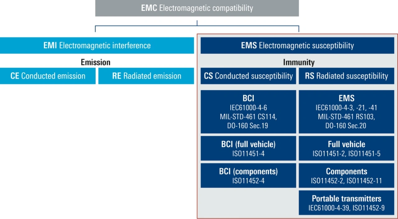 Je nach Produkt und Norm können bei bestimmten Frequenzbereichen, die zwischen 9 kHz und 18 GHz liegen, elektrische Feldstärken von 3 V/m bis 200 V/m gefordert sein. Im Automotivebereich sind es sogar bis zu 600 V/m (Bild 3).