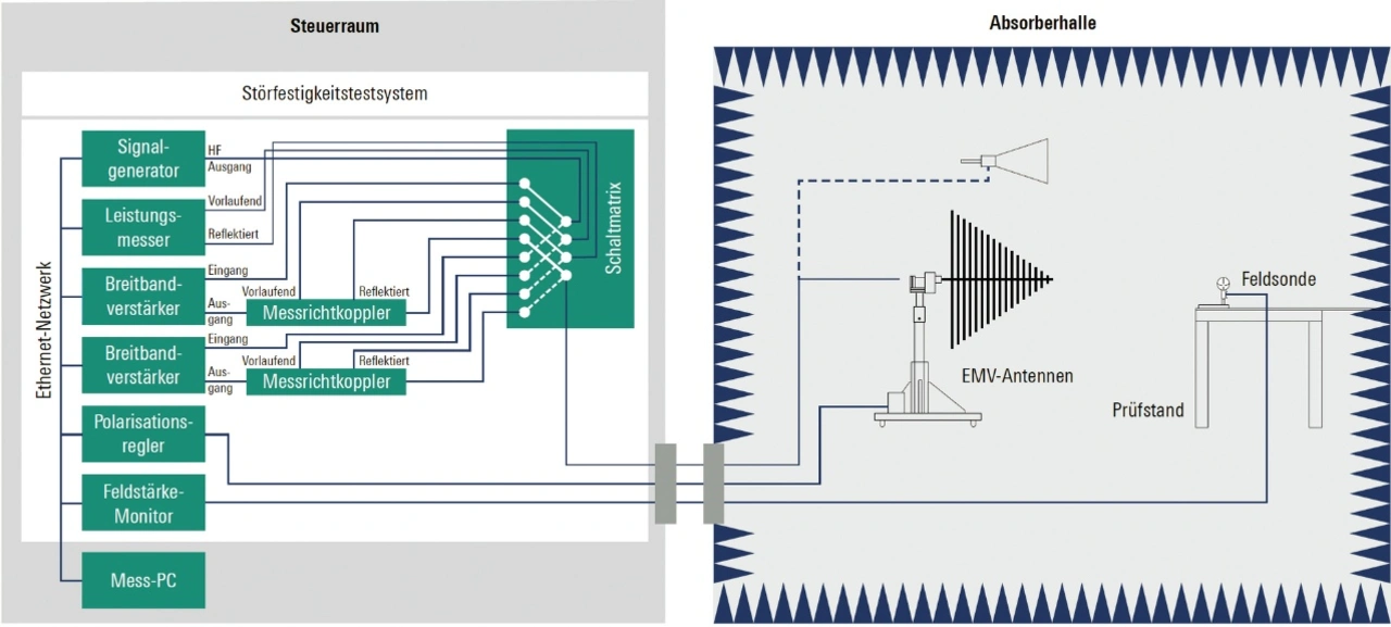 Bild 4 illustriert einen typischen Systemaufbau für Störfestigkeitsprüfungen. Diese finden in aller Regel in einer geschirmten EMV-Testkammer statt. Als Signalquelle dient ein Signalgenerator. Ein breitbandiges HF-Verstärkersystem verstärkt das Signal, das über eine Breitband-HF-Antenne auf das EUT gestrahlt wird. Bei leitungsgebundenen Tests übernimmt eine Stromzange die Aufgabe der Antenne. Ein Messrichtkoppler und ein Leistungsmesser stellen sicher, dass eine definierte HF-Leistung erzeugt wird. Ob die Feldstärke, die von der EMV-Norm gefordert ist, auch tatsächlich am EUT anliegt, validieren eine Messsonde und ein Messempfänger. Eine Steuersoftware übernimmt die Ansteuerung aller beteiligten Geräte und führt das jeweilige Prüfverfahren durch.