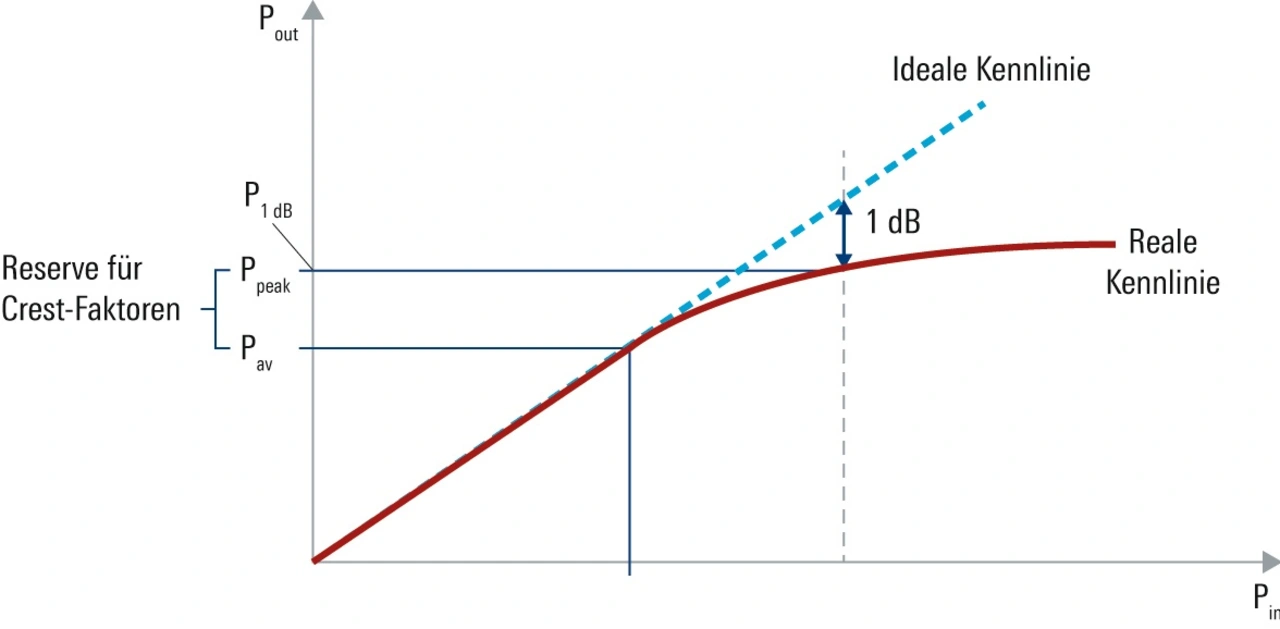 Jeder HF-Verstärker hat eine Kennlinie, die dem Verstärkungsfaktor entspricht und idealerweise linear ist. Das bedeutet: zu einem bestimmten Eingangspegel erzeugt der Verstärker einen größeren Ausgangspegel. Da HF-Verstärker keine unendliche Leistung erzeugen können, sättigen sie oberhalb eines bestimmten Eingangspegels. Das Ausgangssignal wird komprimiert. Der Punkt, an dem das Ausgangssignal um 1 dB gegenüber dem idealen, linearen Pegel komprimiert wird, heißt 1-dB-Kompressionspunkt. Die Ausgangsleistung am 1-dB-Kompressionspunkt wird als P1dB bezeichnet. Bis zu diesem Punkt ist der Verstärker noch annähernd linear, oberhalb davon nehmen die Pegel der harmonischen Störungen gegenüber der Grundwelle stark zu. Daher sollte die harmonische Performance stets am Kompressionspunkt angegeben werden.