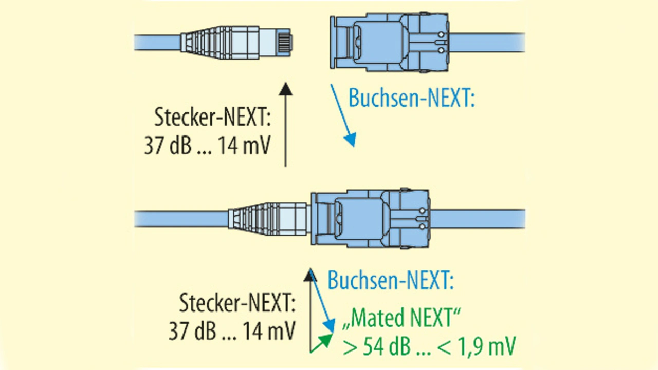 Bild 1 zeigt einen Stecker mit einer NEXT-Dämpfung von 37 dB. Dies entspricht einem Nebensprechen von 14 mV bei einer Anregung von 1,0 V. Die Buchse zeigt ein in etwa gleich großes NEXT; allerdings wurde sie so entwickelt, dass die Phasenlage ziemlich genau invers ist. Verbinden wir den Stecker und die Buchse, ergibt sich ein Stecker-Buchsen-NEXT (Mated NEXT) von weniger als 2 mV. Es werden mehr als 80 % des Stecker-NEXT in der Buchse kompensiert.