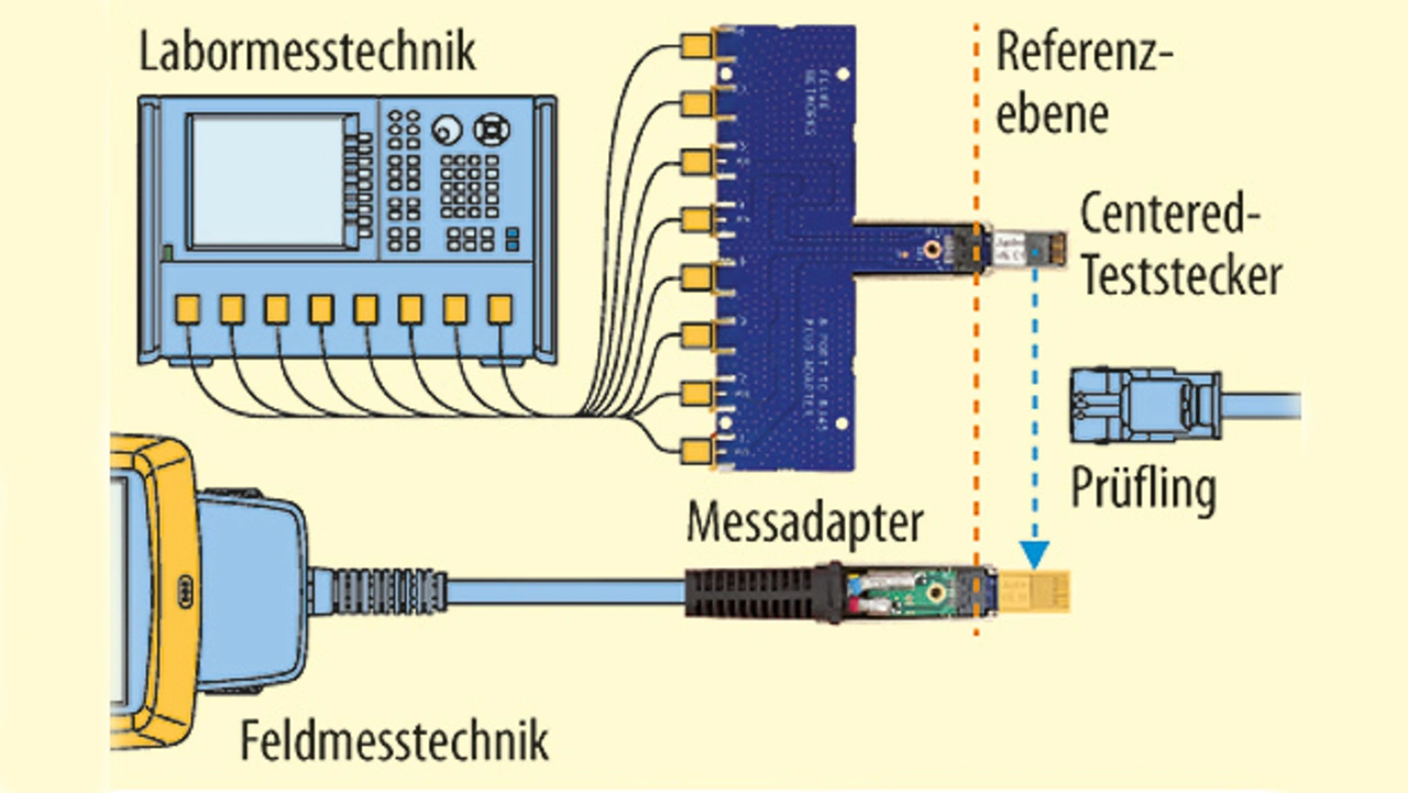 Bild 3 zeigt Messtechnik für Cat. 6A/Cat. 8.1 für Feld und Labor. Wir erkennen den zentrierten Teststecker, der sowohl im Labor als auch im Feld seine Anwendung findet und im Feld als Verschleißteil einfach getauscht werden kann. Die Kontaktierung Messadapter zu Teststecker ist exakt an der durch die Norm definierten Referenzebene.