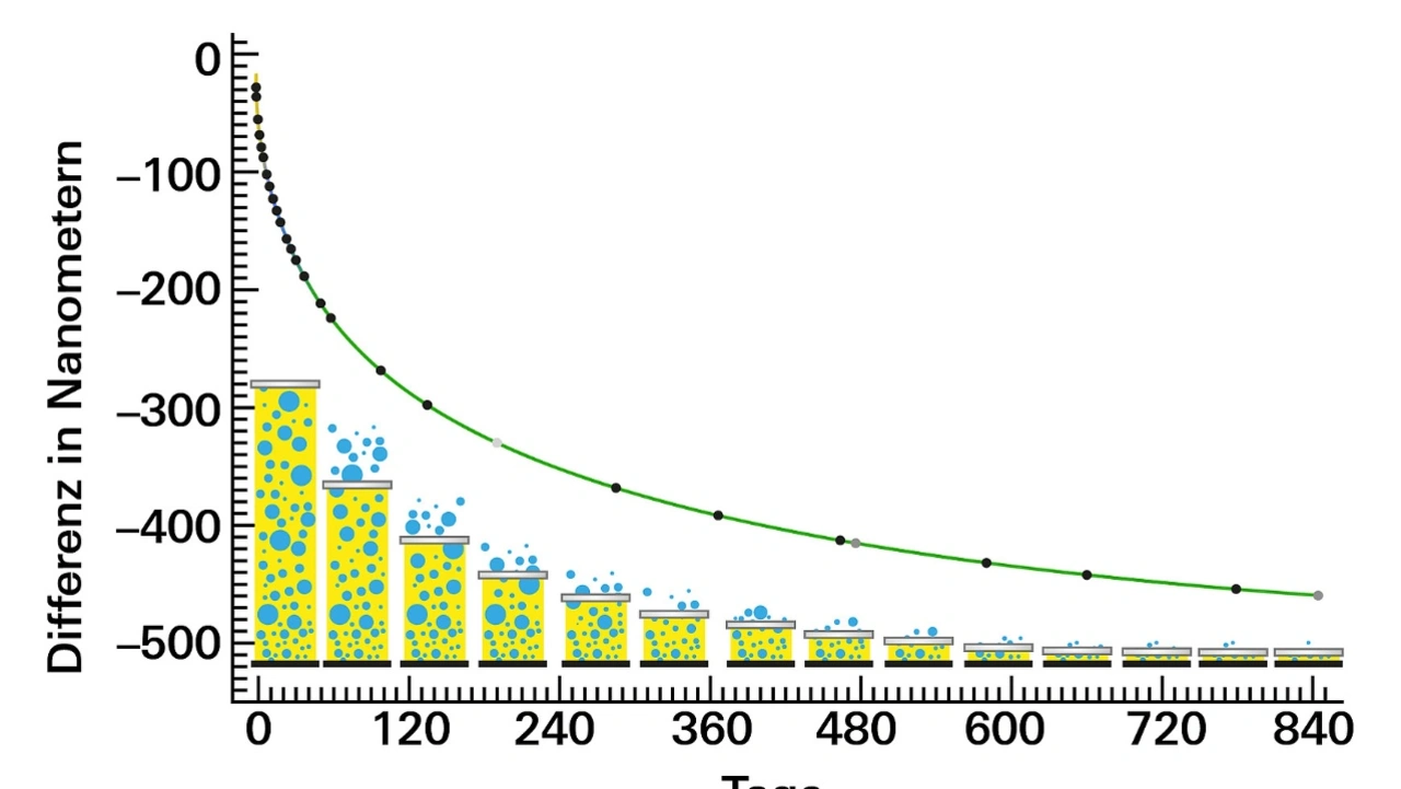 Und das Ergebnis? »Unsere Proben hatten eine Klebespaltdicke von rund 100.000 Nanometern. Im Vakuum verloren sie innerhalb von fast drei Jahren rund 480 nm. Am Anfang ging es sehr schnell, später immer langsamer«, fasst Schödel die Ergebnisse zusammen. »Andersherum war es in gewisser Weise fast dramatisch: Wurde wieder Wasserdampf zugesetzt, um normale, feuchte Umgebungsluft zu simulieren, quoll die Klebeschicht innerhalb nur eines Tages um 33 Nanometer.«