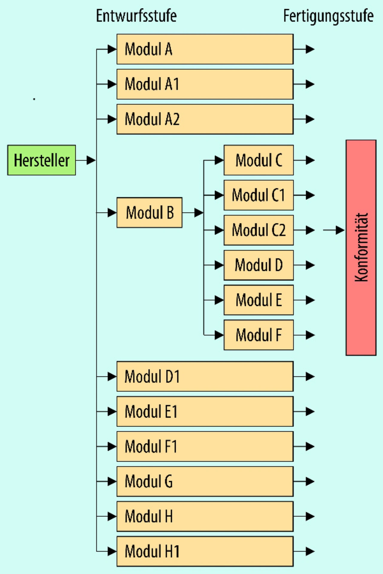 Die Module zur Konformitätsbewertung umfassen den Entwurf und die Fertigung eines Produktes (Bild). Im Rahmen der EMV-Richtlinie hat der Hersteller die freie Wahl des Konformitätsbewertungsverfahrens.