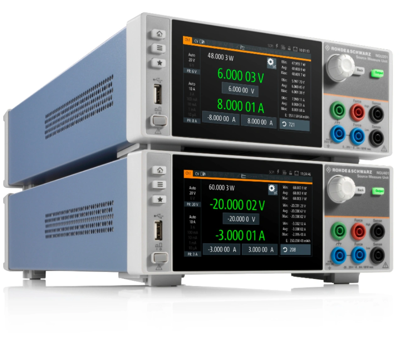 Die beiden R&S NGUs gleichen sich in den grundlegenden technischen Parametern. Sie stellen als Labornetzteil maximal 60 W Leistung bereit, einen Maximalstrom von 8 A und eine maximale Ausgangsspannung von 20 V. Ripple und Rauschen auf der bereitgestellten Ausgangsspannung liegen unterhalb von 500 µV. Für den Ausgangsstrom liegt der Wert für Ripple+Rauschen bei < 1mA.