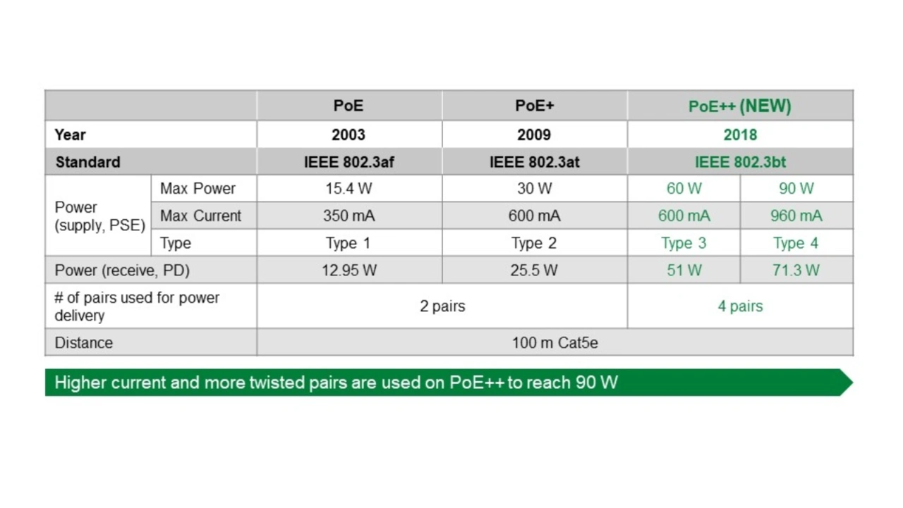 PoE ist eine Übertragungstechnologie, die Strom zusammen mit Daten über Ethernet-Kabel leitet. Ein einziges Kabel versorgt Geräte wie VOIP (Voice over Internet Protocol)-Telefone, Sicherheitskameras mit Internetprotokoll, Wireless Access Points, Netzwerkrouter in Rechenzentren und industrielle Steuersysteme mit Strom und Daten. Der IEEE-Standard für PoE ist 802.3 und wurde seit 2003 weiterentwickelt, um eine höhere Leistung zu ermöglichen. Tabelle 1 zeigt die ursprüngliche Version und die nachfolgenden Überarbeitungen des IEEE-Standards 802.3. Die Weiterentwicklung des Standards von 2018, 802.3bt, allgemein als PoE++ bezeichnet, erlaubt eine maximale Leistung von 90 W und eine Stromstärke von bis zu 960 mA auf den Datenleitungen. Darüber hinaus ermöglicht dieser Standard Ethernet-Übertragungsraten von bis zu 10 Gbit/s (10GBASE-T). Integriert man Strom mit digitalen Niederspannungssignalen, muss man jedoch PoE-Schaltungen vor Stromüberlastungen und Spannungstransienten wie Blitzschlag, ESD und anderen schnellen Transienten, die sich auf einer Wechselstromleitung ausbreiten, schützen.