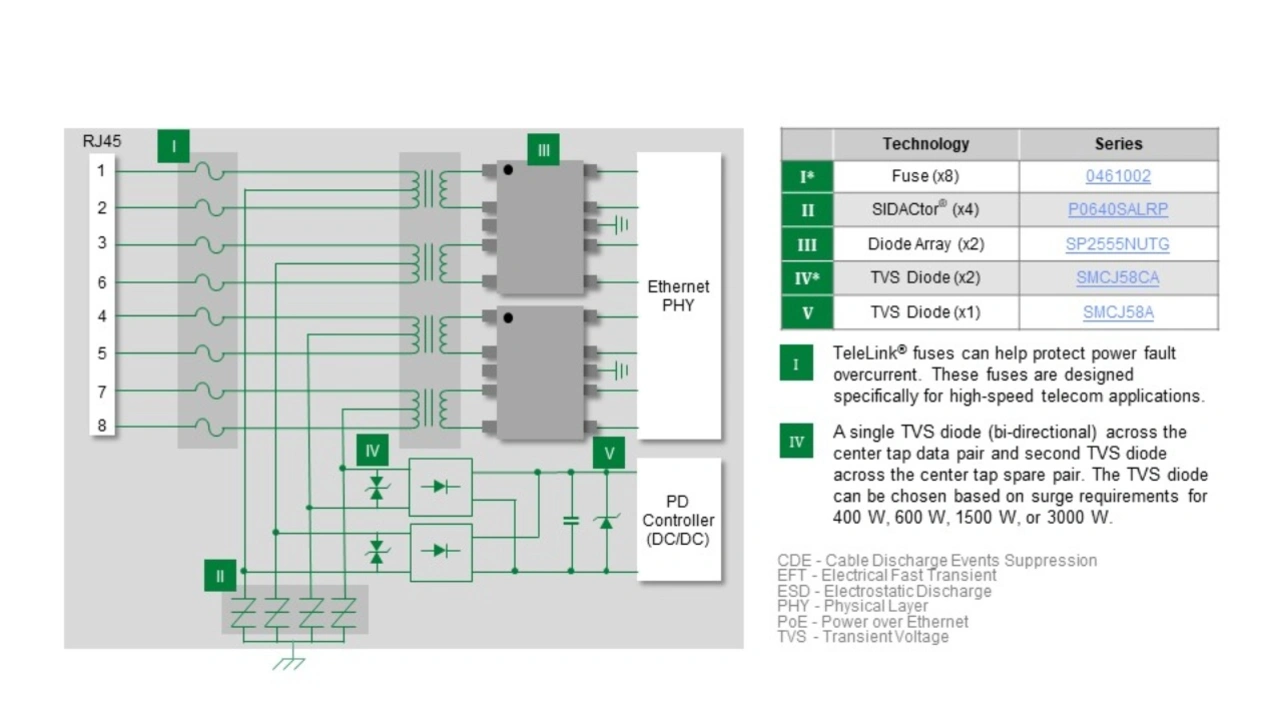 Abbildung 1 zeigt ein Beispiel für ein PoE++-Design und empfohlene Schutzkomponenten für die Absicherung gegen Stromüberlastung und transienten Spannungen. Die Schaltung zwischen dem RJ45-Stecker und dem Schutznetzwerk ist so konzipiert, dass sie sowohl die Ethernet Physical Layer (PHY)-Schaltung als auch den Powered Device (PD) Controller schützt.