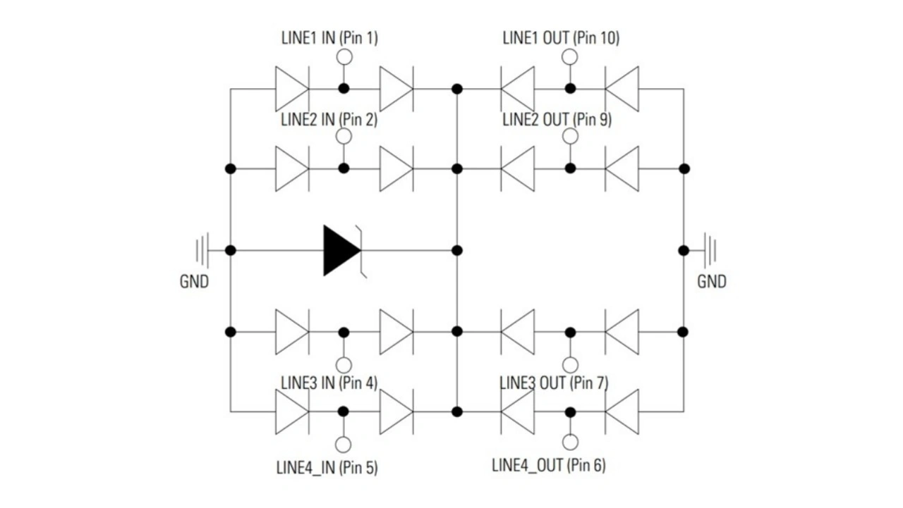 ESD-Schläge, Kabelentladungen und schnelle elektrische Transienten auf den Datenleitungen verursachen häufig Schäden am Ethernet-PHY-Chipsatz. Ein TVS-Dioden-Array (Transient Voltage Suppressor) kann den notwendigen Schutz bieten. Um alle acht Datenleitungen abzusichern, sollten zwei 4-Kanal-TVS-Dioden-Arrays verwendet werden, wie in Abbildung 2 dargestellt. Ein TVS-Dioden-Array bietet folgende Vorteile: