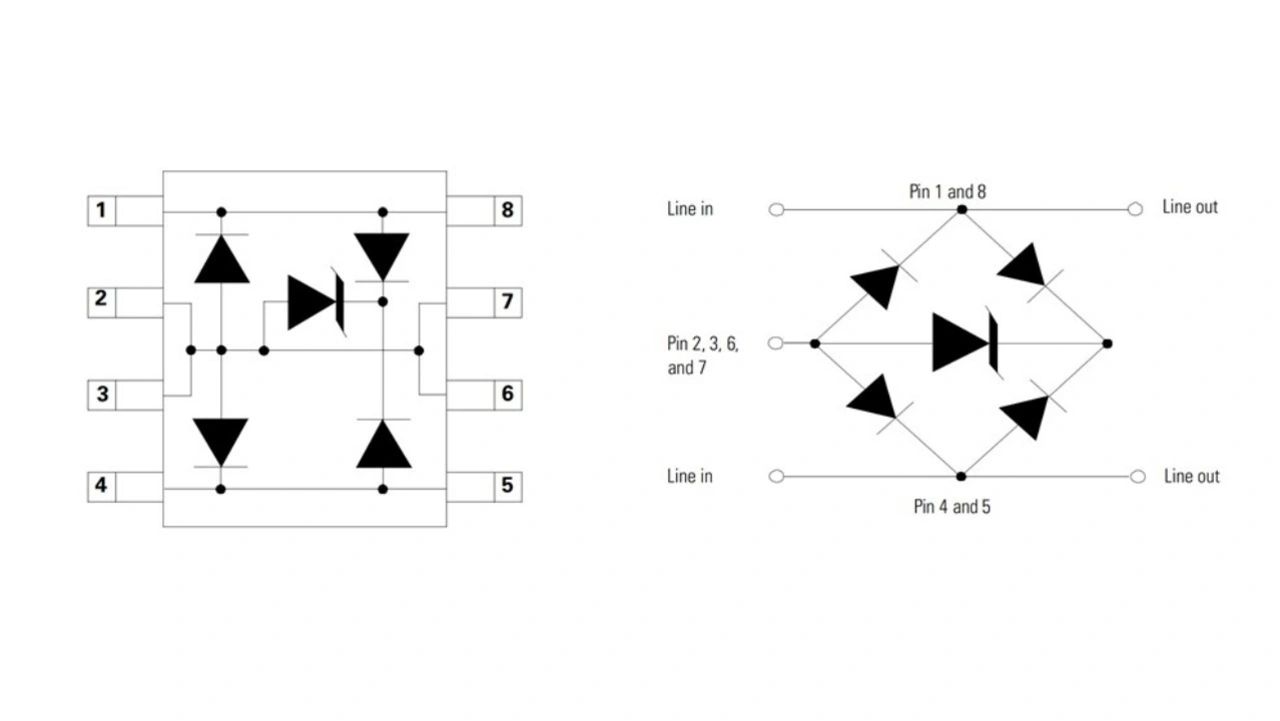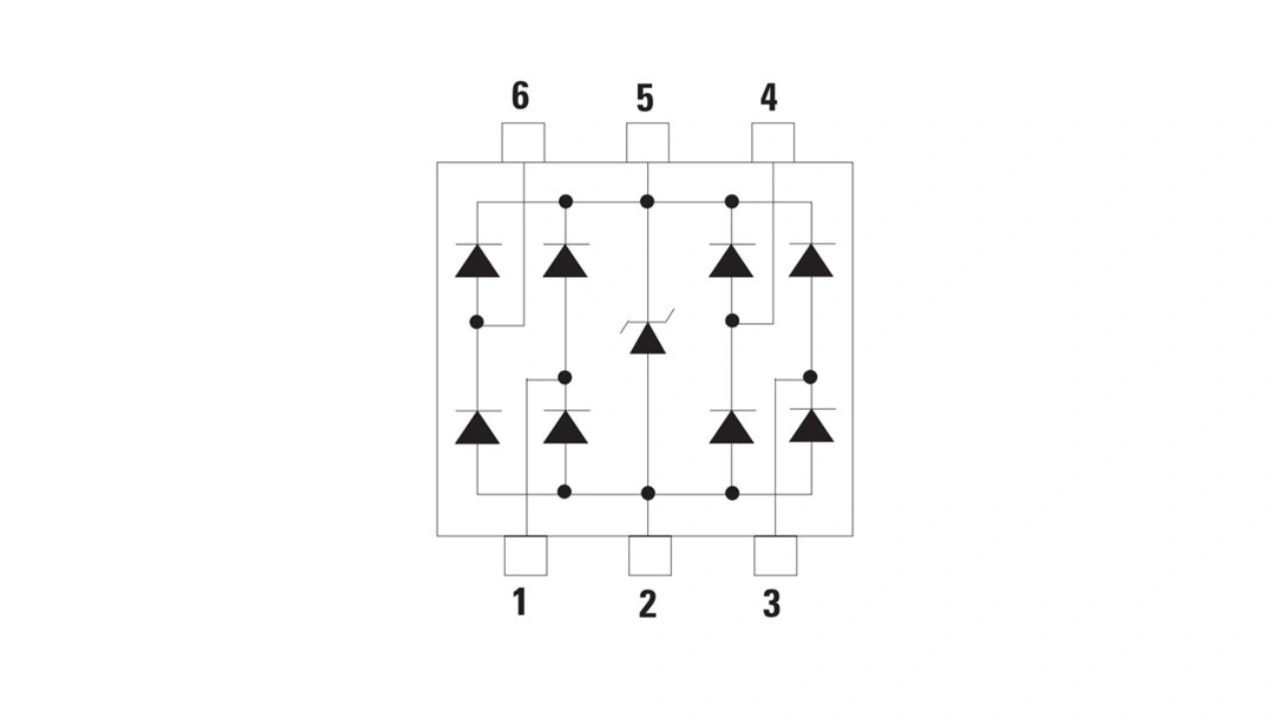 Wie bei anderen Schaltungen kann ein TVS-Dioden-Array den Ethernet-PHY-Chipsatz schützen. Im Falle des PoE-Schaltkreises für den Außenbereich sollte ein TVS-Dioden-Array mit höherer Leistung zum Einsatz kommen, wie die in Abbildung 5 gezeigte 2-Kanal-Komponente. Solche Bauteile können 3.000 W an transienter Leistung oder 150 A Stoßstrom absorbieren. Die integrierte Zener-Diode bietet Transientenschutz für das gesamte Bauteil, und die internen Suppressordioden gewährleisten differenziellen Transientenschutz für die einzelnen Kanäle.