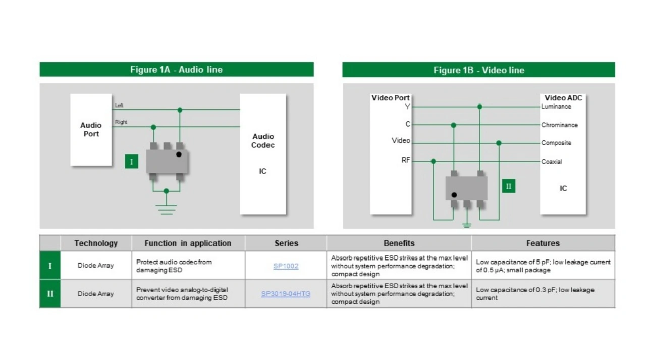 Manche dieser Schutzkomponenten sind durch ihre AEC-Q101-Zertifizierung auch für Automobilanwendungen geeignet. Die Komponente ist in einem oberflächenmontierbaren SOT23-6-Gehäuse erhältlich, um den Platzbedarf auf der Leiterplatte zu minimieren. Ein 4-Kanal-TVS-Dioden-Array-Chip bietet den erforderlichen Schutz mit minimalen Auswirkungen auf die Videosignale.
