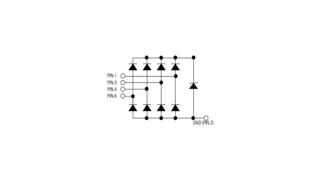 Wie Audioanschlüsse sind auch Videoanschlüsse anfällig für ESD und andere Transienten. Abbildung 1 (rechts oben) zeigt einen analogen Videoanschluss mit seinen vier Ausgangsleitungen, Y, C, Video und RF. Ein einziges Bauteil kann den notwendigen Schutz für einen Video-Analog-Digital-Wandler bieten. In diesem Fall ist die empfohlene Komponente ein 4-Kanal-TVS-Dioden-Array-Chip, wie in Abbildung 3 dargestellt. Dieses Bauteil bietet: