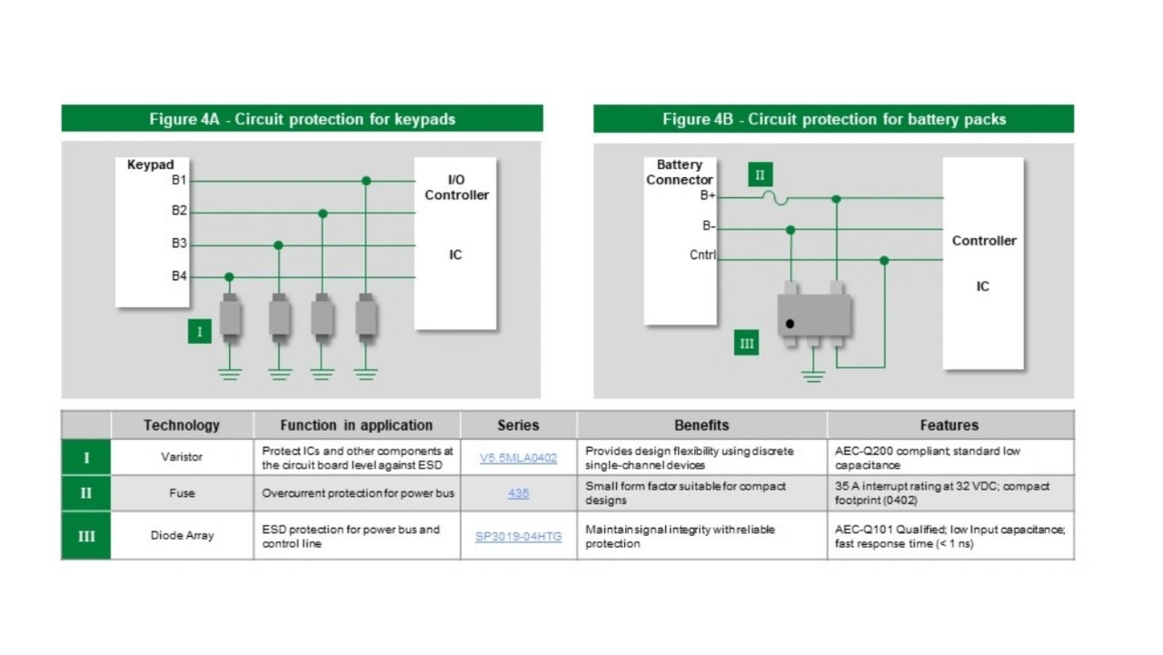 Da der Akku Strom liefert, muss der Controller-Schaltkreis sowohl vor Überstrom als auch vor Spannungsspitzen geschützt werden. Abbildung 4 (rechts oben) zeigt das Blockdiagramm für die Batteriesignale und den Batterie-Controller-Schaltkreis. Da die Batterie Gleichstrom liefert, ist eine schnelle Sicherung für den Überstromschutz am besten geeignet. Sie bietet: