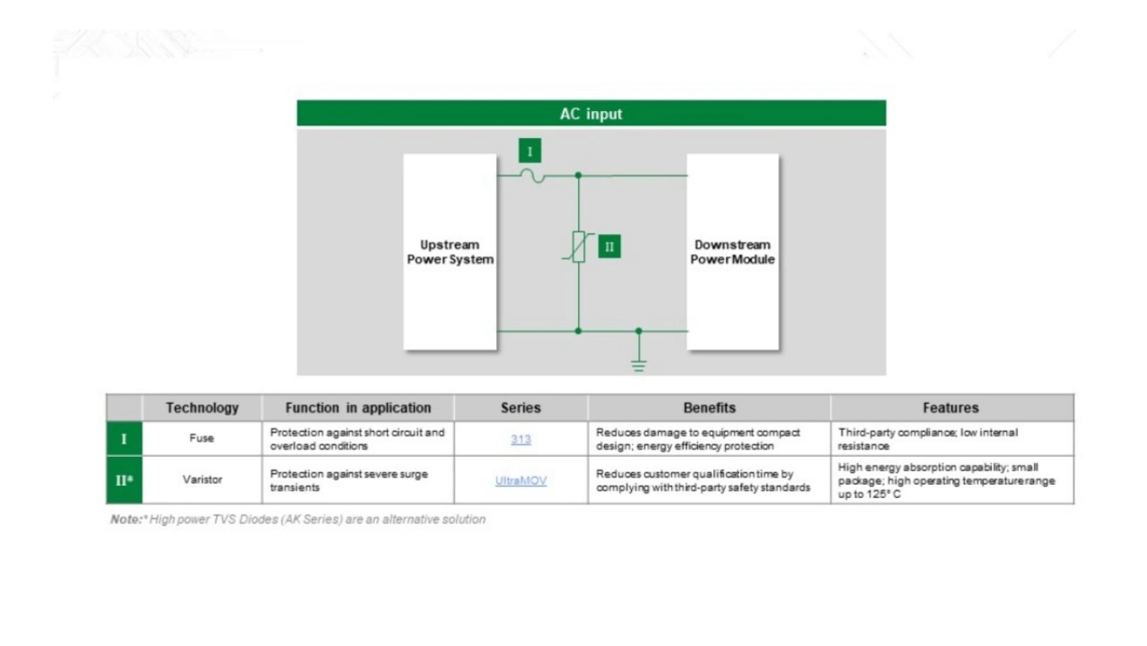 Die Stromkreise sind sowohl Überstrom- als auch Überspannungstransienten ausgesetzt. Diese gehen von den Wechselstromleitungen aus. Der Schutz eines Wechselstromkreises erfordert daher sowohl eine Sicherung für den Überstromschutz als auch einen MOV (Metalloxid-Varistor) für den Überspannungsschutz. Bei einigen Anwendungen kommen auch andere Technologien wie TVS-Dioden, SIDACtoren oder GDTs (Gasentladungsröhren) in Frage. Abbildung 5 zeigt eine geeignete Schutzschaltung. Für AC-DC-Stromversorgungen sollte eine träge Glassicherung verwendet werden. Die träge Sicherung verhindert das Auslösen aufgrund von induktiven Stromstößen auf der AC-Leitung. Weitere Merkmale dieses Sicherungstyps sind:
