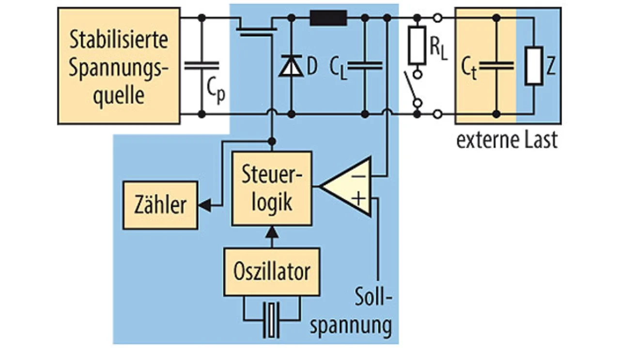 Eine unkonventionelle Lösung fand schließlich ein Entwickler-Team bei Texas Instruments in Freising bei München. Sie arbeitet in gewisser Weise „digital“ – in dem Sinne, dass der Last die Betriebsenergie nicht kontinuierlich zugeführt wird, sondern in einzelnen kleinen Portionen, die dann gezählt werden. Kernelement ist auch hier ein Schaltregler, in diesem Fall ein Abwärtsregler (Buck Converter), in der einfachsten Version bestehend aus Schalttransistor, der Drosselspule, der Diode und dem Speicherkondensator CL (Bild 1). Gespeist wird er aus der stabilisierten Spannungsquelle PPS, deren Ausgangsspannung mit dem Kondensator CP gestützt wird. Am Ausgang des Wandlers liegt die externe Last (also der Mikrocontroller mit seiner extrem stark schwankenden Stromaufnahme), parallel dazu der Kondensator CT. Bei Bedarf kann über einen Schalter eine feste Last (ein bekannter Widerstand) dazu geschaltet werden.