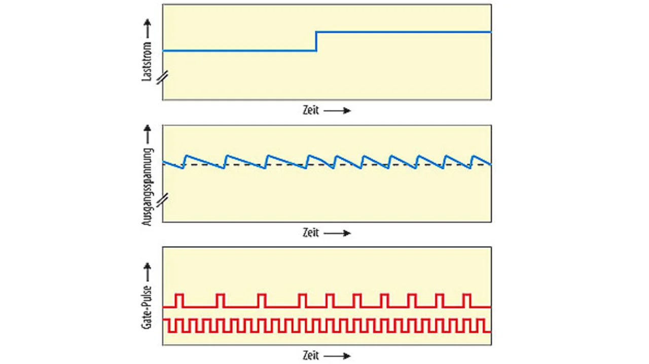 Bild 2. Die Schaltung im realen Betrieb: Die Ausgangsspannung hat noch eine gewisse Welligkeit – mit sägezahnförmigem Verlauf, für die Funktion nicht mehr störend. Bei einem Sprung von einem niedrigen auf einen höheren Strom steigt die Schaltfrequenz.