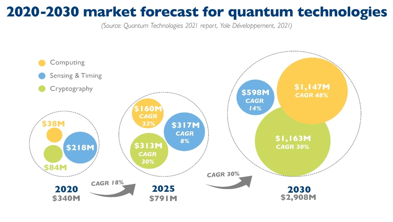 Zwischen Quantencomputer und Quantenkommunikation tut sich aber noch eine interessante Welt auf – die der Quantensensorik. Unter der Rubrik quantenbasierte Messtechnik, in der es beinahe ausschließlich um Quantensensorik geht, listet des BMBF aktuell acht Förderprojekte – laufende sowie abgeschlossene – mit einem Gesamtvolumen von rund 17,7 Mio. Euro. Quantensysteme sind extrem sensibel für Änderungen in ihrer Umgebung und eignen sich daher als hochempfindliche Sensorelemente für Messgrößen wie Zeit, Temperatur, Magnetfelder, elektrische Ströme, Rotation und Beschleunigung. Tatsächlich gehen Analysten von Yole Développement davon aus, dass der aktuelle Weltmarkt für Quantensensorik & Timing deutlich größer als der für Quantencomputer und Quantenkryptographie ist und sich diese Verhältnisse erst zwischen 2025 und 2030 spürbar umkehren werden (Bild 1).