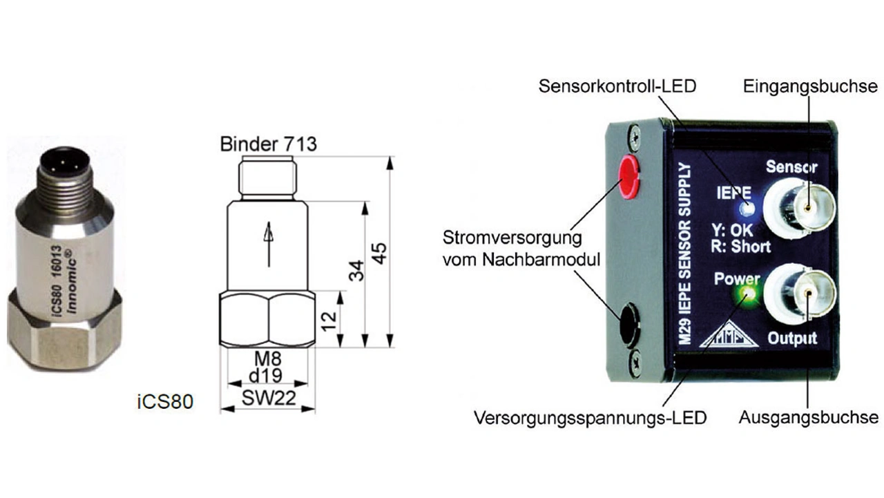 Für die praktische Messungen an einer Anlage wurde das Körperschall-Mikrofon iCS80 [1] von Innomic verwendet, welches explizit für die Industrie und damit für die Überwachung von Ma- schinen und Anlagen vorgesehen ist. Es verfügt über eine hohe Resonanzfrequenz von etwa 32.000 Hz und bietet dadurch einen großen Frequenzbereich von 0,13 Hz bis etwa 22.000 Hz. Der Sensor hat einen Spannungsausgang nach dem IEPE-Standard (Integrated Electronics Piezo Electric) und ist somit kompatibel mit Systemen anderer Hersteller (Bild 1).
