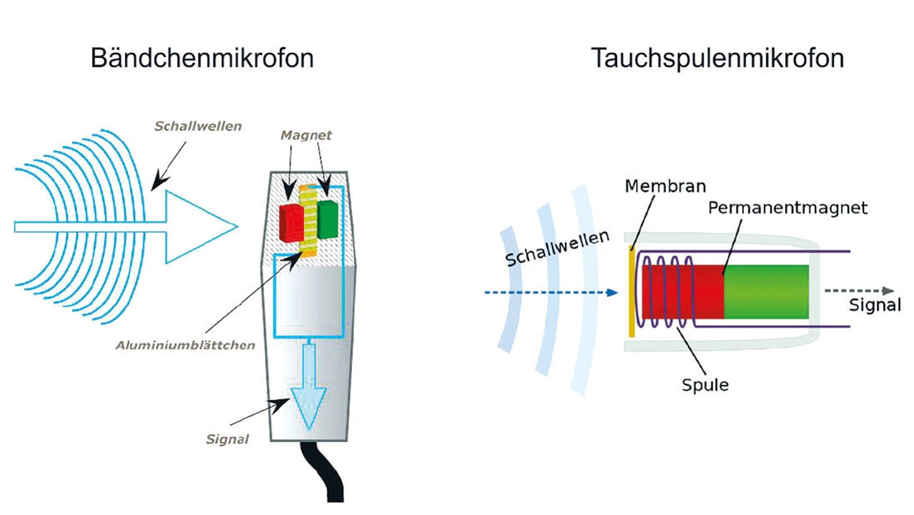 Im Mikrofon ist ein elektrischer Leiter mit der Membran verbunden. Dieser Leiter befindet sich im Luftspalt eines mit dem Mikrofongehäuse verbundenen Magneten und wird dort durch die Schwingungen der Membran bewegt. Die induzierte Spannung u ist proportional zum magnetischen Feld B, zur Leiterlänge l und zur Geschwindigkeit des Leiters v.