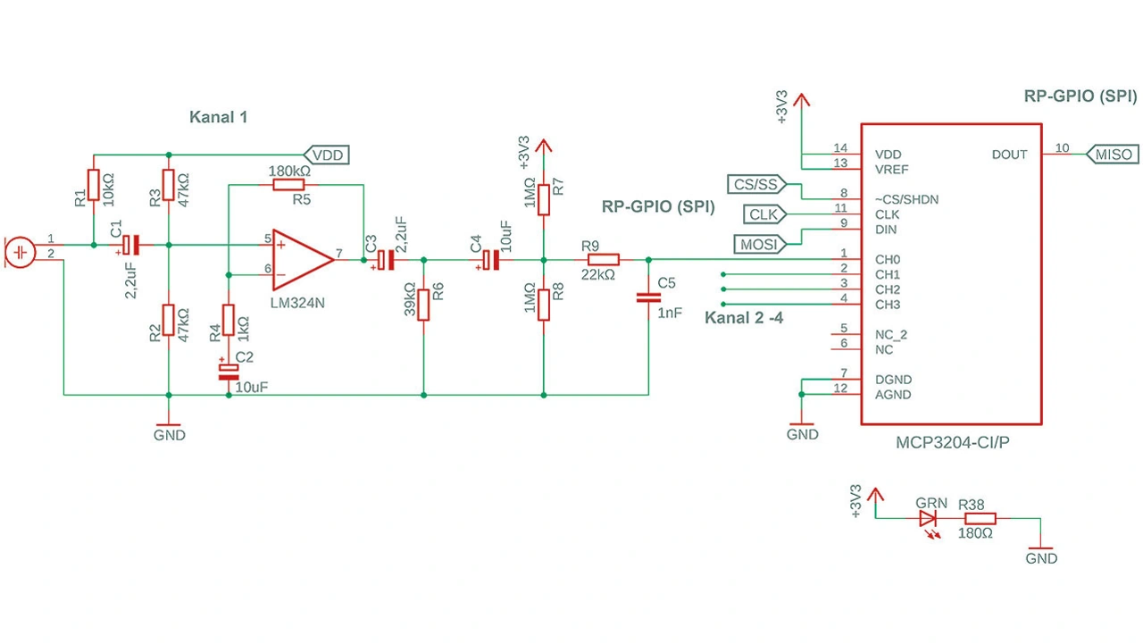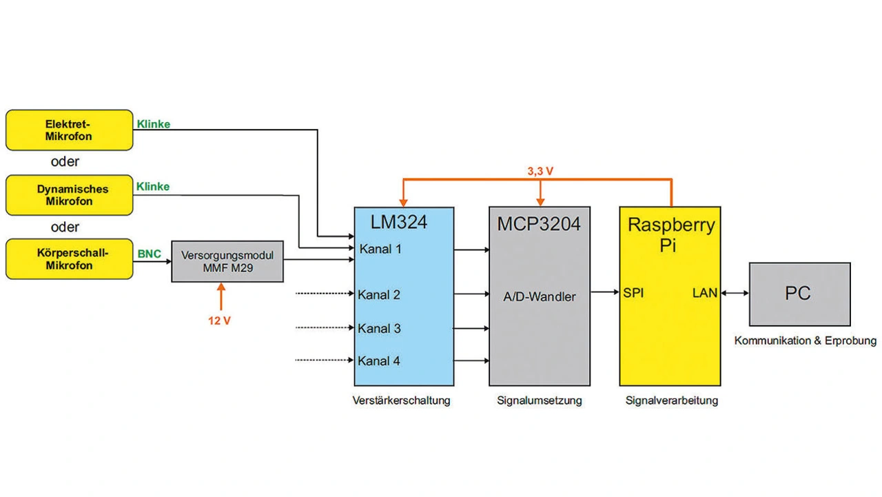 Für die Signale der Schallmikrofone wird eine Verstärkerschaltung benötigt, die die jeweilige Ausgangsspannung auf den Dynamikbereich des nachgeschalteten A/D-Umsetzers anhebt. Maximal sollen vier Mikrofone gleichzeitig betrieben werden können, deren Signale ein Raspberry Pi weiterverarbeiten soll, der deshalb um eine Verstärker- plus A/D-Umsetzerschaltung zu erweitern ist. Hierfür wurde eine vierkanalige Schaltung entwickelt und aufgebaut, die mit dem Raspberry Pi per SPI-Schnittstelle kommuniziert.