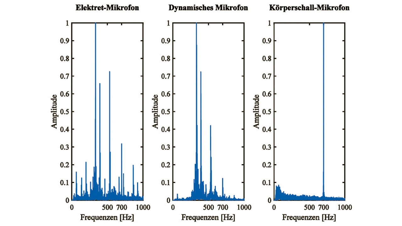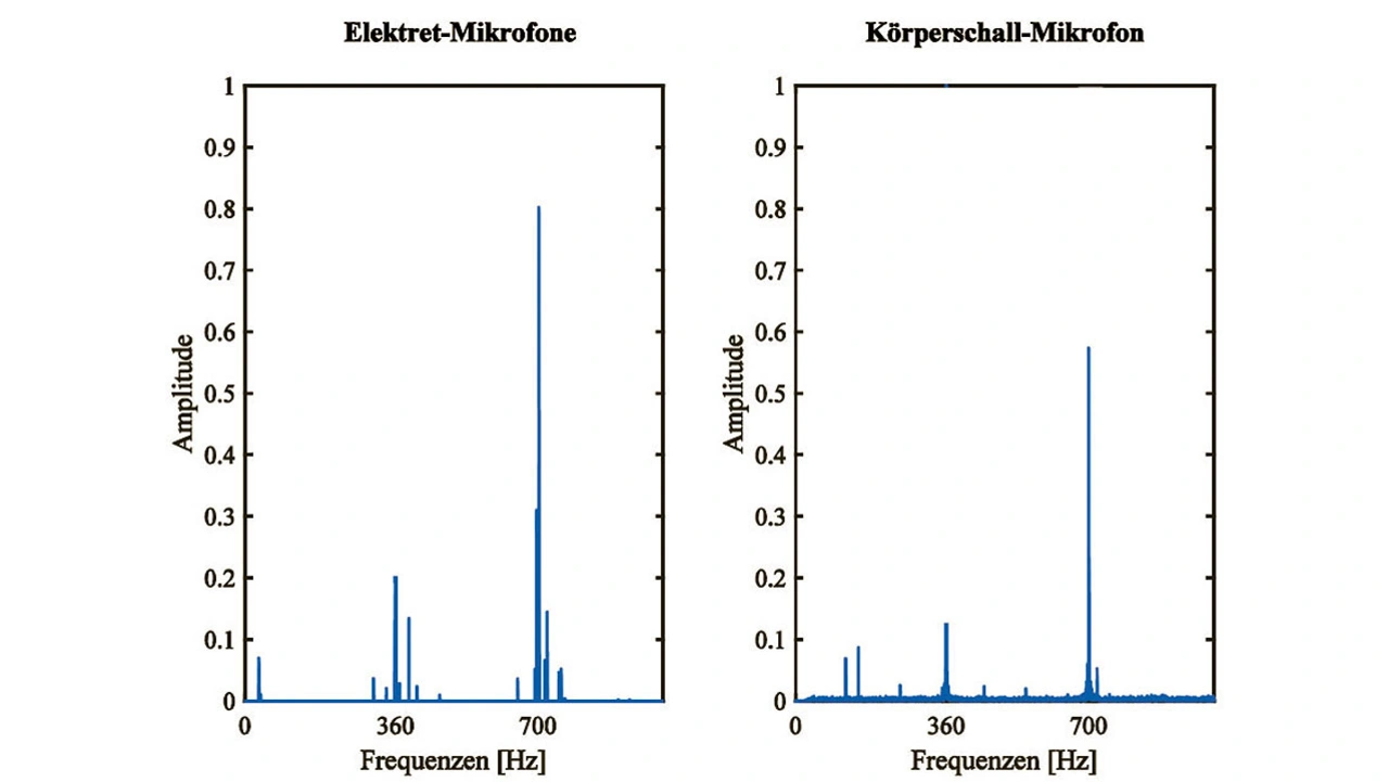 Wenig überraschend stellte sich heraus, dass das Körperschallmikrofon die besten Ergebnisse lieferte, d. h. Umgebungsgeräusche haben nur einen geringen Einfluss auf das Spektrum, und ohne besondere Maßnahmen lassen sich Maschinengeräusche hiermit exakt aufnehmen (Bild 5). Gleichwohl war das Geräusch bei 700 Hz so dominant, dass die beiden anderen Mikrofonarten dieses Signal ebenfalls detektieren konnten. An den Messergebnissen in Bild 5 lässt sich zudem die unterschiedliche Richtcharakteristik eines Elektret- und eines dynamischen Mikrofons erkennen. Aufgrund der Kugelcharakteristik der Elektretmikrofone nehmen sie Geräusche in einem größeren Bereich wahr als die dynamischen Mikrofone mit einer gerichteten Charakteristik. Ob es sich dabei um unerwünschte Umgebungsgeräusche oder gewünschte Maschinengeräusche handelt, ist durch eine entsprechende anlagenabhängige Kalibrierung zu ermitteln, wofür die jeweiligen Mikrofonpositionen (Abstände) natürlich eine wichtige Rolle spielen.