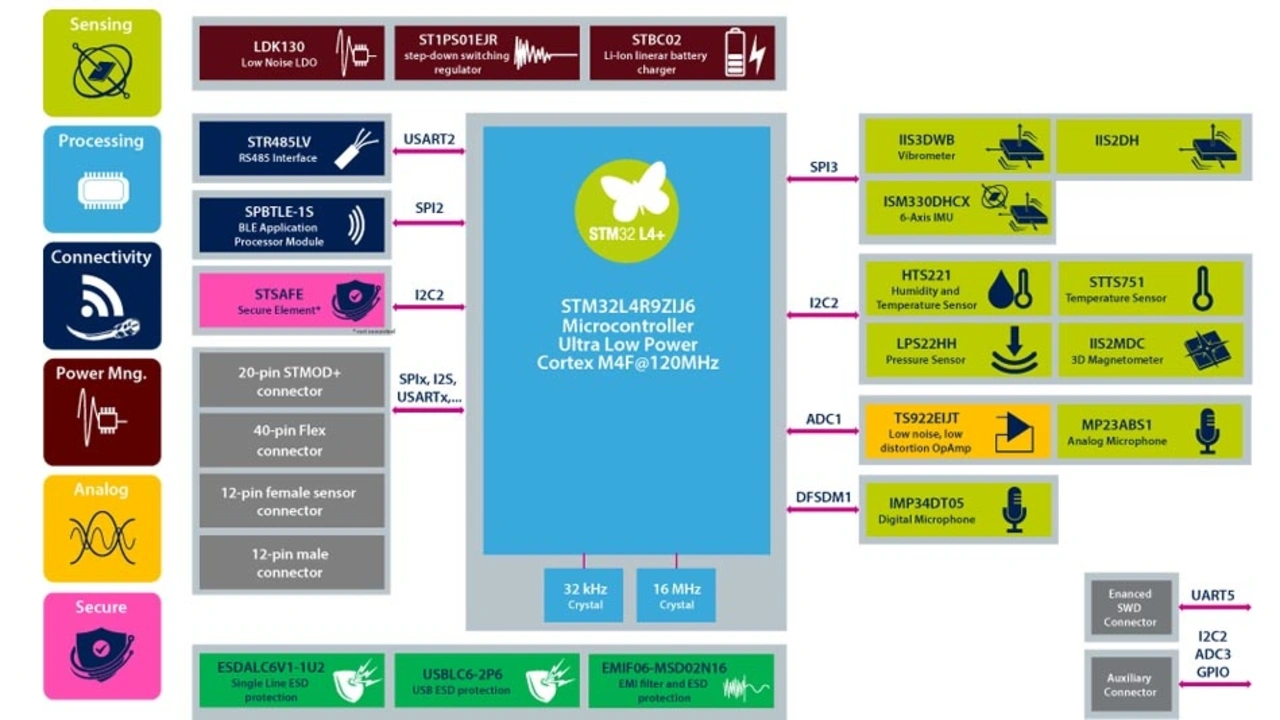 Das STWIN-Kit unterstützt dieses Konzept mit einem Ultra-Low-Power-Mikrocontroller der STM32L4+-Familie. Dieser Controller verfügt über einen Arm-Cortex-M4-Kern, der mit seiner Taktfrequenz von 120 MHz und einer Gleitkommaeinheit gut für die Signalverarbeitung geeignet ist. Insgesamt kann der Mikrocontroller neun Sensordatenströme verarbeiten. Beispielcode im Firmware-Paket des Eval-Boards demonstriert, wie sich das System programmieren lässt.