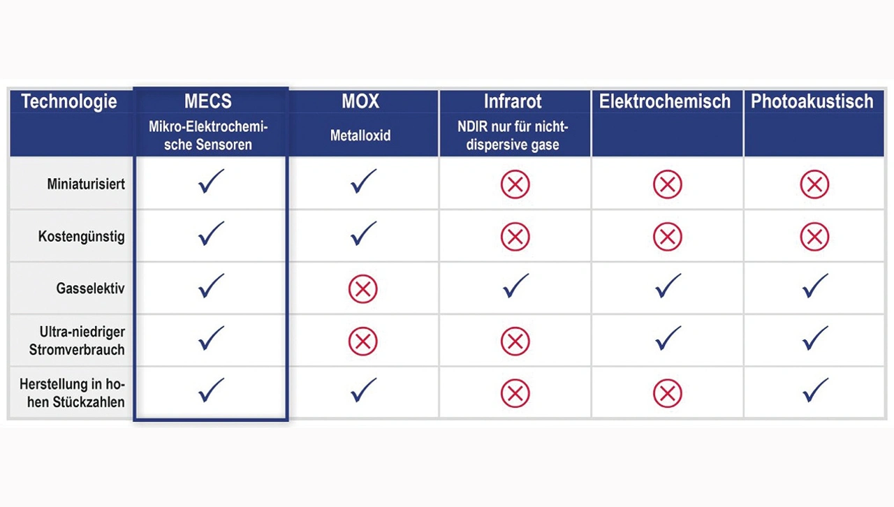 Die Hauptkomponenten eines Gassensors basierend auf der MECS-Technologie sind ähnlich wie bei einem herkömmlichen elektrochemischen Sensor, lediglich die Bauform ist wesentlich kleiner, und die Sensoren können mit MEMS-Prozessen produziert werden: