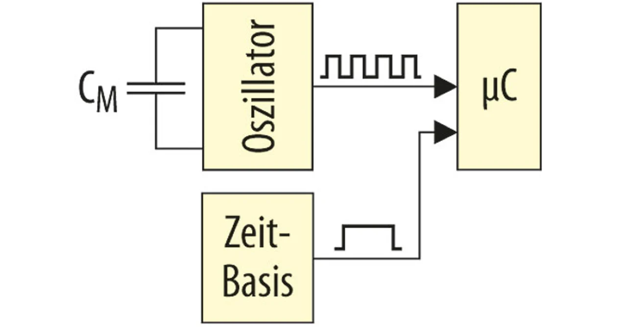 Sicherlich die Gruppe, die immer noch am häufigsten im Feld zu finden ist, sind Messungen, die Zeit oder Frequenz auswerten. Dabei werden die unbekannten Kapazitäten entweder in einer Oszillatorschaltung genutzt, deren Frequenz dann gemessen wird (Bild 1), oder es wird über eine bekannte Impedanz eine Lade- bzw. Entladekurve zeitlich vermessen.