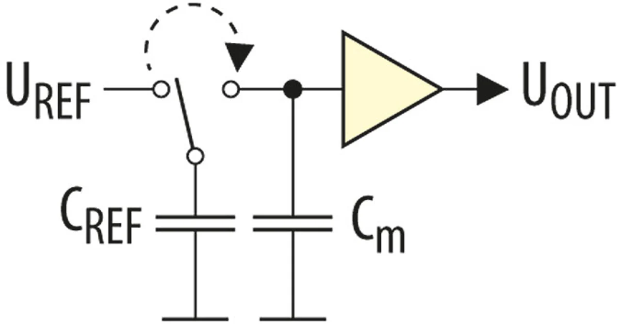 Dabei geht es darum, die Ladung einer bekannten Kapazität auf eine unbekannte zu übertragen und anhand des Ladungszustands beider auf die unbekannte Kapazität zu schließen. Im einfachsten Fall (Bild 2) schließt man mittels eines Schalters die unbekannte und die (voll geladene) bekannte Kapazität zusammen und kann dann mittels einer einfachen Spannungsmessung auf den Ladezustand der Gesamtkapazität (bekannte plus unbekannte Kapazität) und damit auf die Messkapazität zurück rechnen. In der Praxis wären dazu allerdings sehr hochwertige Schalter mit Eingangskapazitäten weit unterhalb des Messwertes (bei Zielwerten im pF-Bereich eine Herausforderung) notwendig, die möglichst temperaturstabil sind.