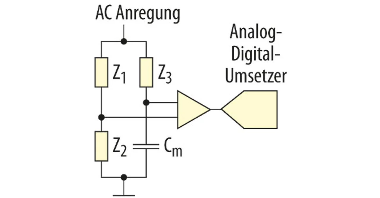 Das Prinzip ist einer klassischen Wheatstone-Brücke sehr ähnlich. Wie bei jener werden zwei Spannungsteiler miteinander verglichen, wobei in einem von den beiden die Messkapazität liegt (Bild 3). Die Differenz der beiden Mittelabgriffe wird verstärkt und digitalisiert. Dabei ist zu beachten, dass im Gegensatz zur klassischen Widerstandsbrücke die Versorgung der Brückenschaltung in jedem Fall eine Wechselspannung geeigneter Frequenz sein muss.