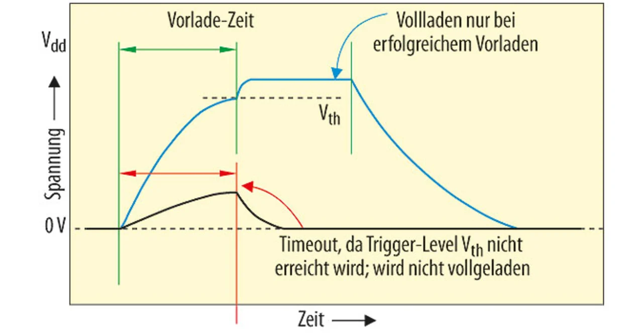 Durch den extrem hohen internen Takt ist eine sehr hohe Auflösung möglich; der Vergleich mit einer bekannten Kapazität macht das Verfahren unempfindlich gegenüber Schwankungen dieses Taktes. Der Baustein PicoCap, in dem das Verfahren angewendet wird, kann aber noch mehr. Um leicht festzustellen, ob die Messkapazität auch anliegt oder ob ein Kurzschluss vorliegt, wird zum Aufladen zuerst eine hohe Impedanz angelegt; das Vollladen erfolgt dann über den Messwiderstand (Bild 5). Über die Ladekurve können dann Kurzschluss, Drahtbruch und Messkapazität sehr leicht unterschieden werden. Um den Einfluss von parasitären Kapazitäten, die das Messergebnis verfälschen, zu eliminieren, wurde ein Verfahren entwickelt, damit diese erfasst und herausgerechnet werden können.