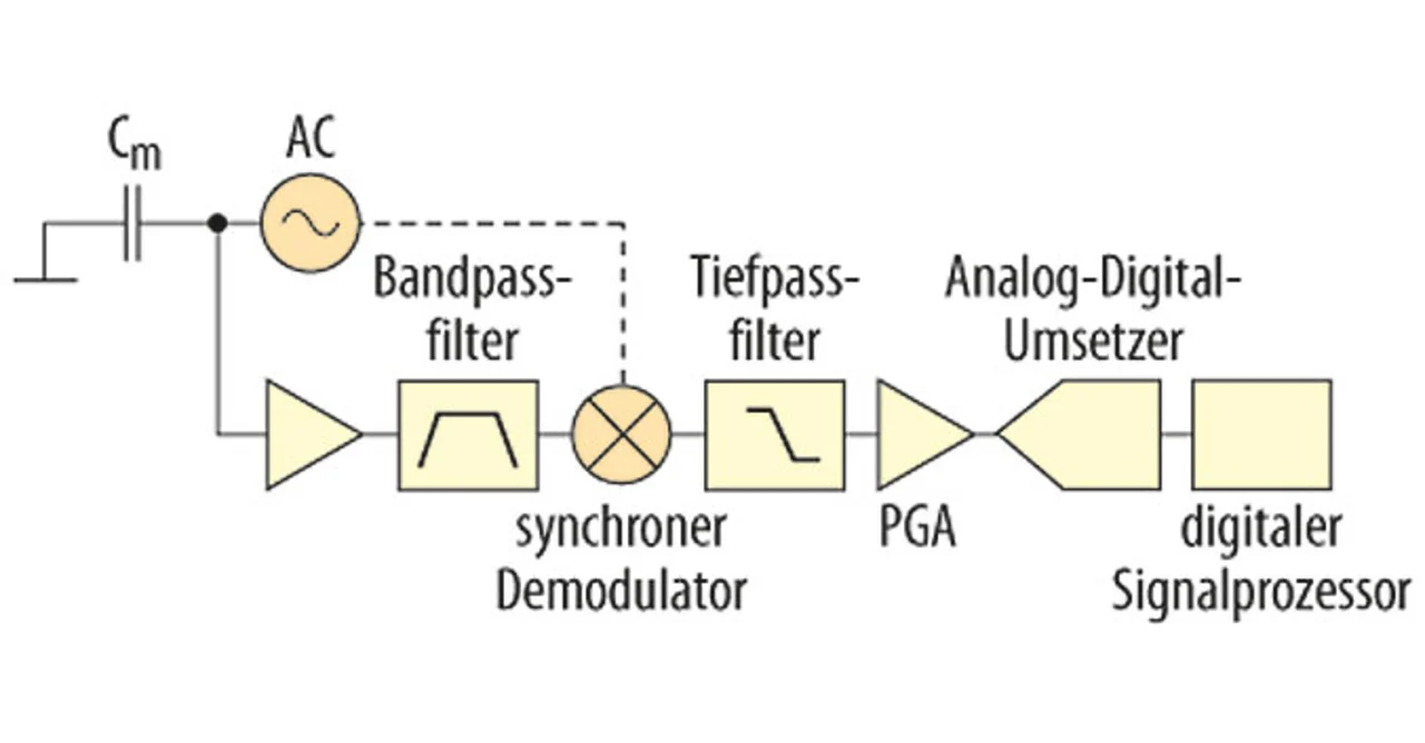 In vielen Anwendungen sind Messkapazitäten starken Störungen ausgesetzt und kapazitive Messverfahren sind – wie schon erwähnt wurde – häufig sehr anfällig für solche Störungen, handelt es sich doch im Allgemeinen bauartbedingt um Antennen nicht unbeträchtlicher Größe. Im Einzelfall (zum Beispiel bei der Sitzbelegungserkennung) ist die Messkapazität durchaus relativ klein, die geometrische Ausdehnung muss aber groß sein, um über einen großen räumlichen Bereich Annäherungen erkennen zu können. Weiter sind solche Sensoren auch Umwelteinflüssen ausgesetzt, die zwar die Messkapazität unbeeinflusst lassen, parallel dazu jedoch einen Leitwert aufbauen, der die Ladung/Entladung beeinflusst und von daher das Messergebnis verfälscht. Der Halbleiterhersteller AMS hat ein Verfahren entwickelt, das diesen Problemen Rechnung trägt und für verschiedene Anwendungen in Serie gebracht wurde. Im Rahmen eines Testchips steht es auch anderen interessierten Kunden zur Verfügung.