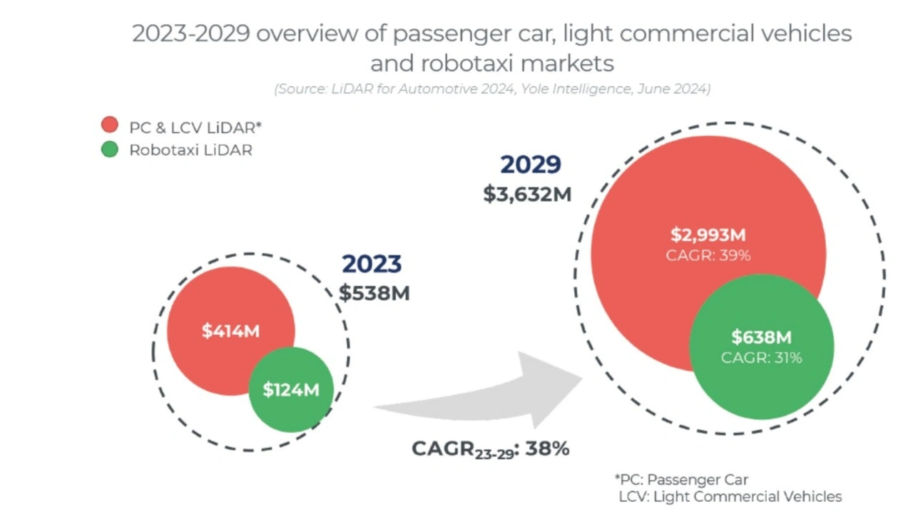 Prognosen von Yole Development zufolge wird der weltweite Automotive-LiDAR-Markt von rund 538 Millionen US-Dollar im Jahr 2023 auf 3,632 Milliarden US-Dollar im Jahr 2029 wachsen. Das entspricht einer durchschnittlichen jährlichen Wachstumsrate von 38 %.