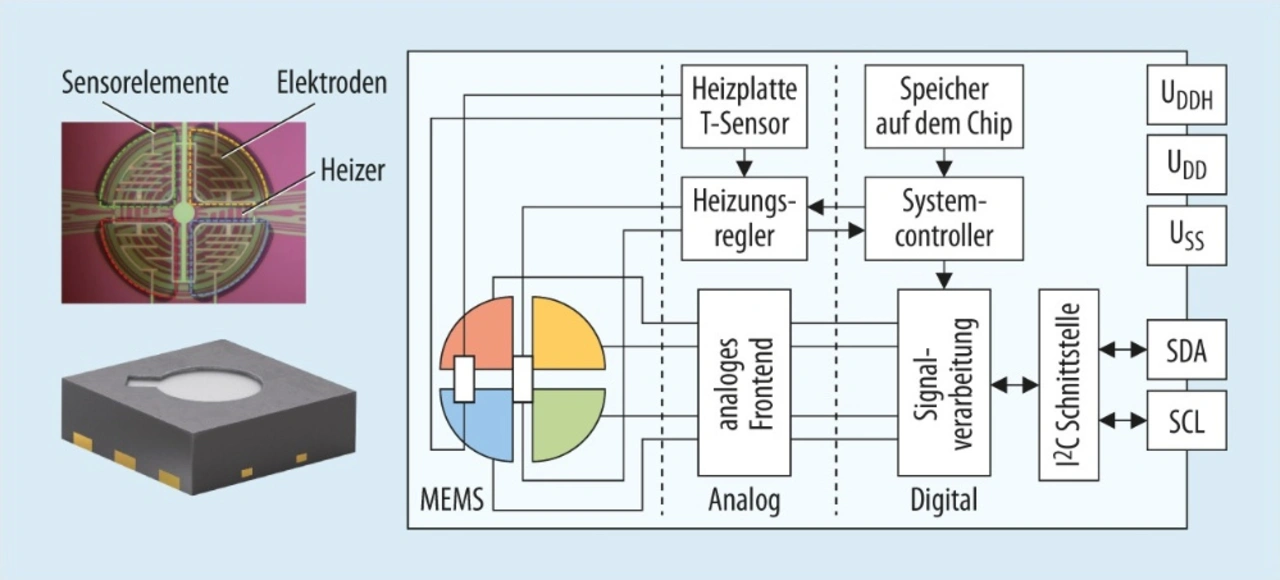 Das kleine Gehäuse birgt vier verschiedene Metalloxid-Elemente (Pixel) in Form von porösen Nanopartikelfilmen auf einer Mikro-Heizplatte, zusammen mit dem zugehörigen ASIC auf einem Chip. Durch Verrechnung der Einzelsignale verbessert sich die Selektivität, und es sind mehrere Gase gleichzeitig messbar. Dank einer sehr kleinen thermischen Masse liegt die Reaktionszeit bei 50 ms, und es lassen sich kontrollierte Temperaturprofile über einen Bereich von mehreren 100 °C durchfahren.