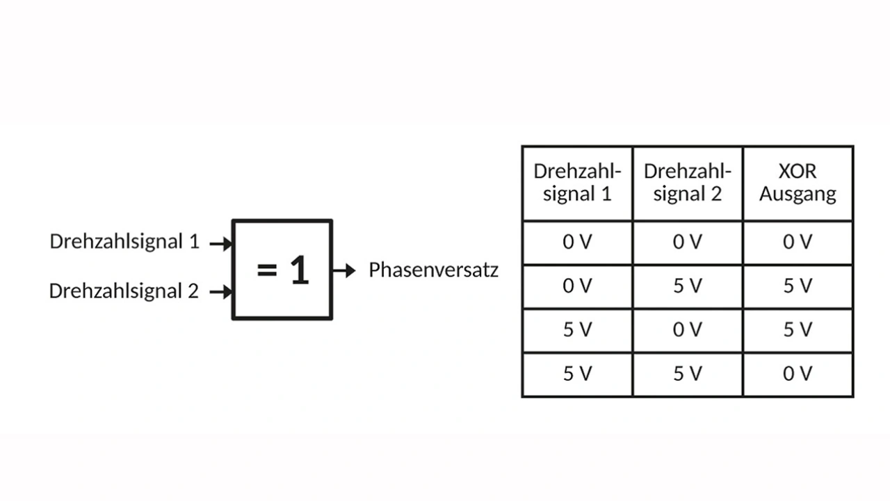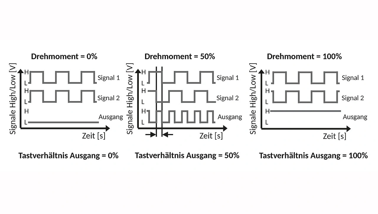 Die Signalauswertung soll an dieser Stelle nicht im Detail dargestellt werden. Als anschauliche Lösung kann eine einfache Signalauswertung mithilfe eines XOR-Gatters (Exklusiv-Oder-Gatter) dienen. Die Eingänge werden direkt mit den TTL-Signalen der Hallsensoren beaufschlagt, und der Ausgang liefert in Form eines zeitlichen PWM-Signals ein Maß für den Phasenversatz der Signale und somit für die Verdrehung bzw. mit bekannter Wellensteifigkeit einen Messwert für das Drehmoment. In der konkreten Applikation wird die Auslegung entsprechend der verfügbaren Möglichkeiten im Steuergerät erfolgen.
