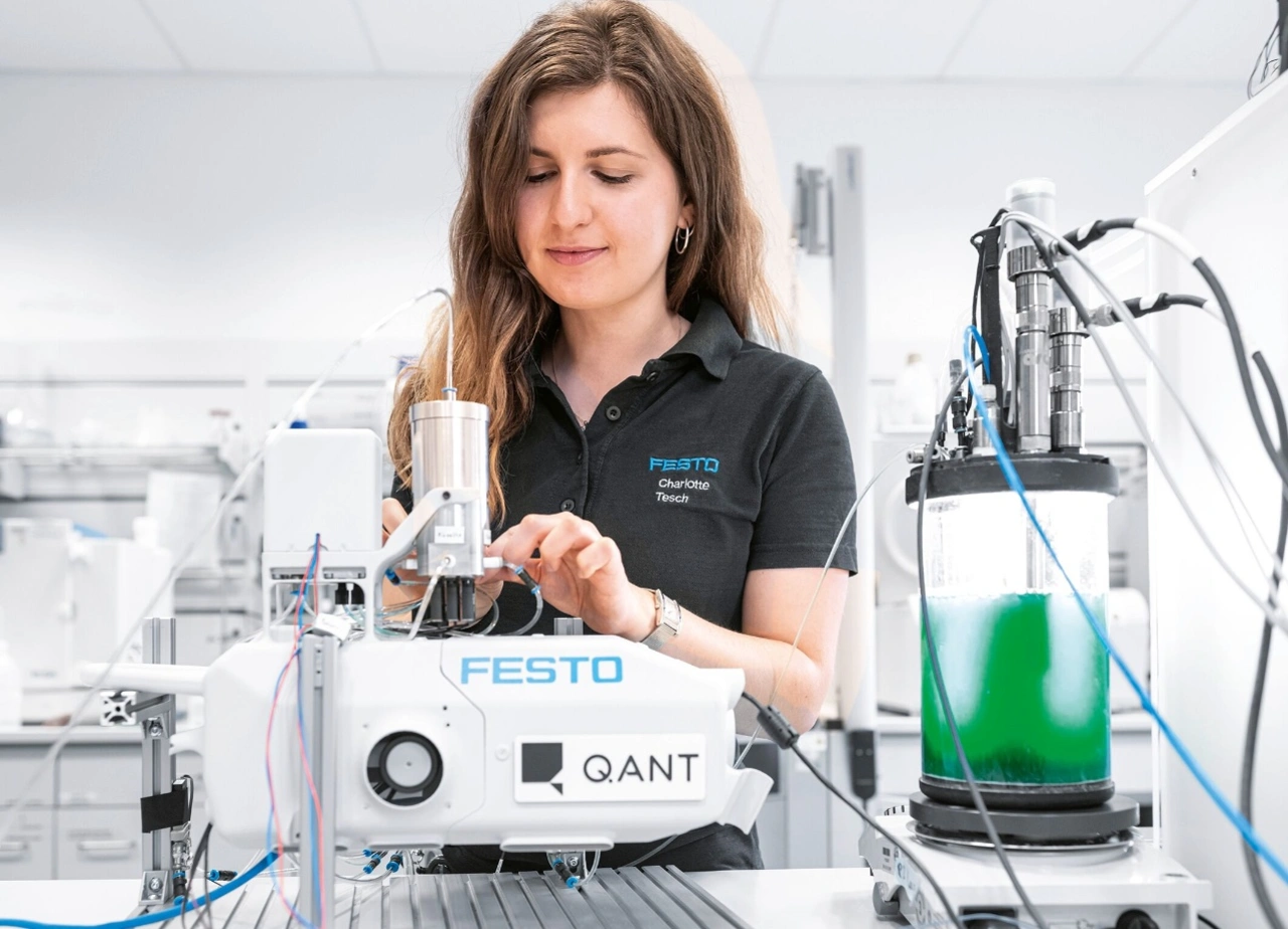 Der Steuerungs- und Automatisierungsspezialist Festo zeigt auf der Hannover Messe einen Algenreaktor, der mit Hilfe des Quantensensors von Q.ANT präzise und in Echtzeit Auskunft über das Wachstum der Organismen im Inneren der Anlage erhält. Die Algen werden dem Sensor dafür automatisiert und kontinuierlich durch spezielle mikrofluidische Komponenten von Festo zugeleitet, beispielsweise Pumpen zur präzisen Steuerung kleinster Flüssigkeitsmengen. Der Quantensensor ist in der Lage, einzelne Zellen optisch zu analysieren, so dass die Menge der Biomasse exakt ermittelt werden kann. Zusätzlich untersucht er die Zellen mit Hilfe von künstlicher Intelligenz auf ihre Vitalität. Mit Hilfe des Quantensensors ist es möglich, vorrausschauend auf Prozessereignisse, zum Beispiel geringeres Wachstum, zu reagieren und regelnd einzugreifen, um ein schnelleres und sicheres Wachstum der Algen zu ermöglichen.