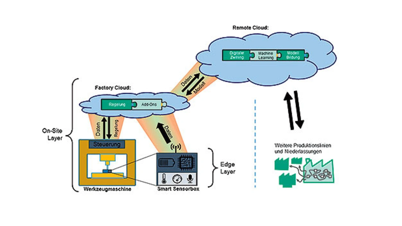Für die Bauteilüberwachung von BLISK-Komponenten wird ein Vibrationssensor sowie ein Neigungs- und Orientierungssensor am Multisensor betrieben. Alle Daten der Sensoren werden in Echtzeit an eine Factory Cloud weitergeleitet und dort verarbeitet. In einer solchen prozessnahen Cloud können latenzkritische Aufgaben erledigt werden, wie zum Beispiel Datenvorverarbeitung, Steuerungsaufgaben und Eingriffe in die Feldebene. Für aufwendige und zeitunkritische Berechnungen werden die Daten in einer Remote Cloud gespeichert. In dieser werden Big-Data-Analysen, Digitale Zwillinge und Prozessmodelle erzeugt. Diese Modelle können durch den bidirektionalen Austausch wieder in der Factory Cloud genutzt werden, um so eine kontinuierliche Optimierung des Prozesses und der Werkstückqualität zu garantieren.