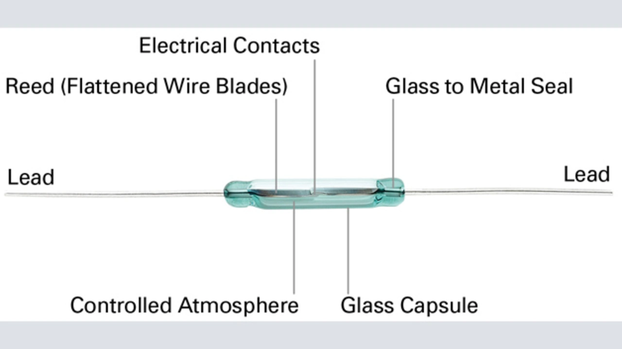 Reed-Schalter (Bild 2) werden durch ein angelegtes Magnetfeld betrieben. Diese passive Komponente benötigt keinen Strom. Der Schalter besteht aus zwei bis drei dünnen Kontaktzungen aus Metall, den sogenannten Reeds. Diese haben legierte Enden, die sich in sehr geringem Abstand überlappen. Durch ihren einfachen Aufbau und hohe Zuverlässigkeit eignen sich Reed-Schalter vor allem für Anwendungen mit geringer Leistungsaufnahme.