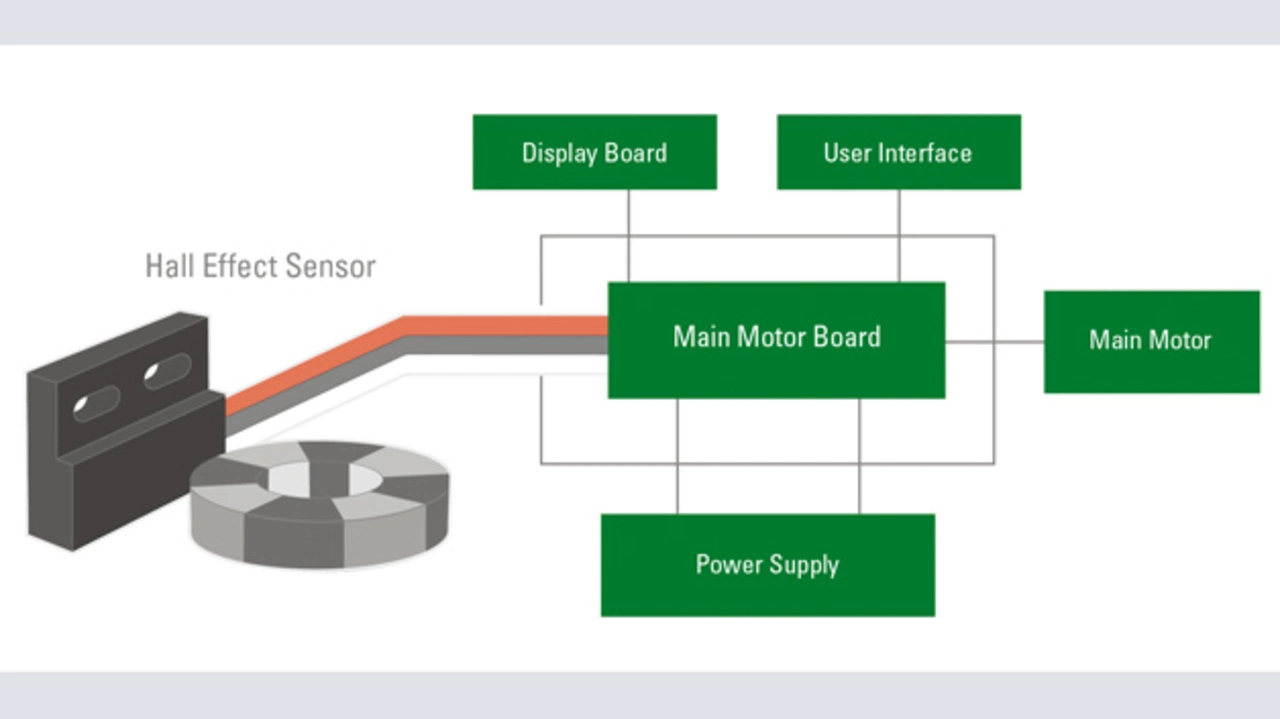Zum Beispiel wird in Waschmaschinen die Drehgeschwindigkeit der Trommel meist durch einen Hall-Effekt-Sensor überwacht (Bild 3). Über diesem rotiert ein 16- oder 32-poliger Magnet, der an der Motorwelle befestigt ist. Das digitale Geschwindigkeitssignal wird an die Steuereinheit übertragen, die die Motorgeschwindigkeit für die jeweiligen Programmabschnitte anpasst.