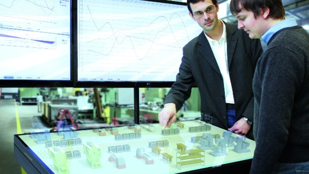 Die durch Industrie 4.0 aufkommende Flut an Daten ist enorm und mehr als unübersichtlich. Der Mitarbeiter jedoch merkt davon nichts: Mit einem Blick auf den Multitouch-Tisch sieht er die gesamte Fabrikhalle samt allen Produktionsmaschinen und erkennt Störungen sofort. Möglich macht es das System Plant@Hand3D des Fraunhofer IGD.