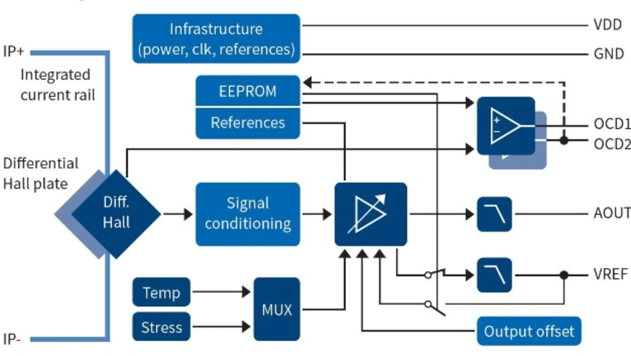 Bild 2 zeigt das Block-Diagramm des XENSIV TLI4971. Der Stromfluss durch die Stromschiene auf der Primärseite induziert ein magnetisches Feld, das von den zwei differenziellen Hall-Elementen gemessen wird. Ein leistungsfähiger Verstärker kombiniert das Signal des differenziellen Feldes mit der Kompensations-Information der Temperatur- und Stress-Messung. Letztendlich wird das Ausgangssignal mit einer hohen Bandbreite von 120 kHz ausgegeben
