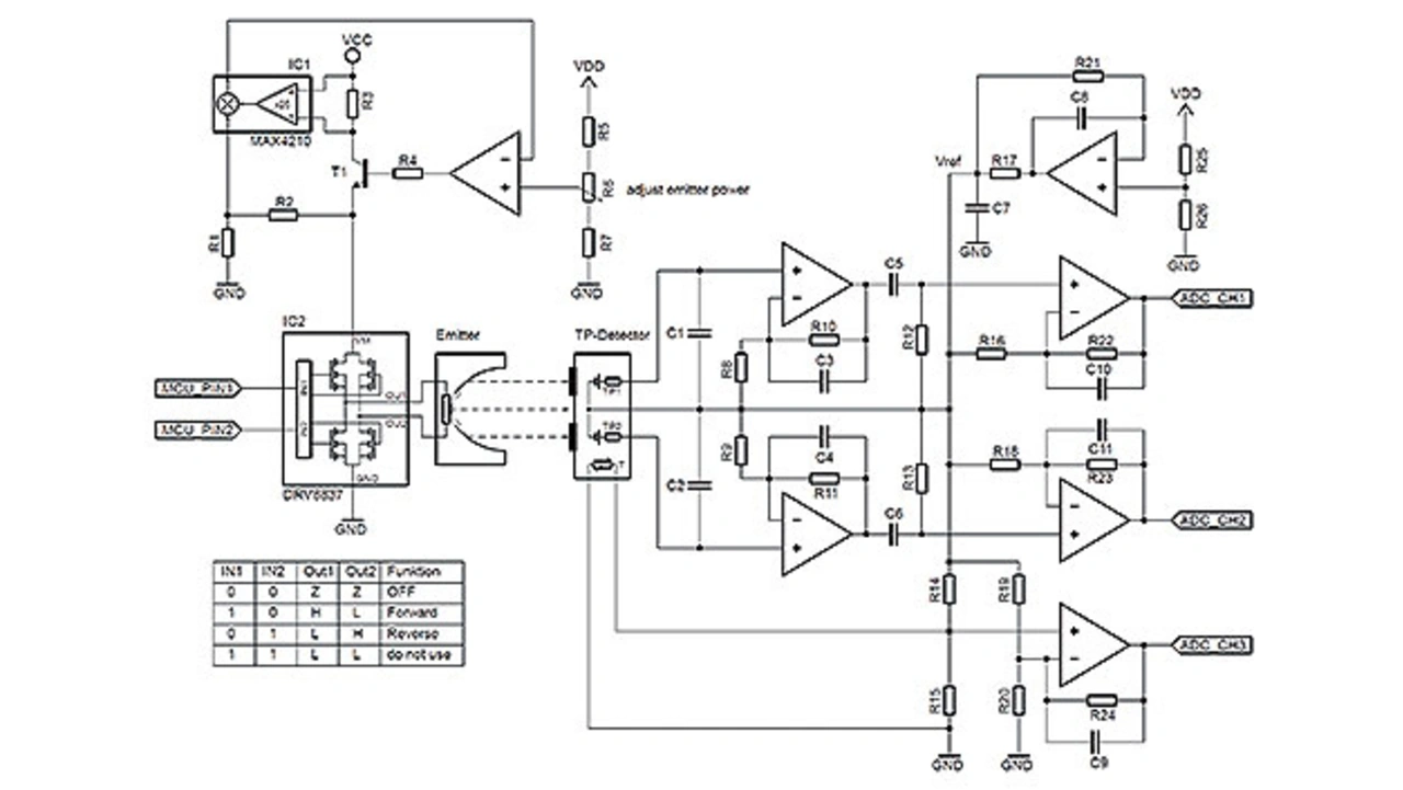 Der integrierte Temperatursensor im Detektorgehäuse dient zur softwareseitigen Kompensation der Gaskonzentration. IC6 bildet mit dem dazugehörigen Widerstandnetzwerk R15 bis R19 einen Brückenverstärker. Mit diesem kann das Temperatursignal auf den Anwendungstemperaturbereich skaliert werden. Bei dem IC18 handelt es sich um einen Leistungsmonitor vom Typ MAX4210 der zusammen mit dem Regler IC17 und T1 die Leistung des Infrarotemitters auf einen konstanten Wert regelt. Dazu wird der Emitterstrom über den Shunt-Widerstand R24 gemessen und mit der Emitterspannung multipliziert. Aufgrund des zulässigen Eingangsspannungsbereiches des MAX4210 muss die Emitterspannung über den Spannungsteiler R25, R26 reduziert werden. Der Leistungswert kann über das Potenziometer R21 eingestellt werden. Bei IC19 handelt es sich um einen Vollbrückentreiber. Über die beiden Steuereingänge IN1 und IN2 kann die Stromrichtung durch den Emitter gesteuert und elektrisch moduliert werden. Ein stromkommutierender Betrieb des Emitters erhöht die Lebensdauer durch Vermeidung von Elektromigrationseffekten. Diese schaltungstechnischen Maßnahmen sind vorteilhaft, um Alterungseffekte des Emitters zu reduzieren und somit die Langzeitstabilität des Messsystems zu optimieren.
