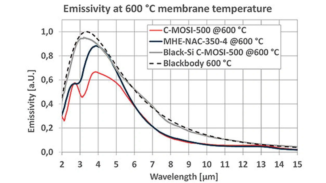 Die spektrale Charakteristik wird jedoch durch den konkreten Schichtaufbau, die beteiligten Materialien und gegebenenfalls zusätzliche laterale Strukturierungen beeinflusst und weist praktisch einen gegenüber dem idealen Planckspektrum diskontinuierlichen Wellenlängenverlauf auf (Bild 4). Einige Anwendungen, wie z.B. die Messungen von Alkohol um 9 µm, erfordern zusätzliche Maßnahmen, um die Emission in diesem Bereich gezielt anzuheben. Hier kommen zusätzliche, mikrostrukturierte und funktionalisierte Schichten zum Einsatz. Die erreichbare Dynamik wird durch die Wärmekapazität und den Wärmetransport der aktiven Heizmembran dominiert. Kleinere Strahler erreichen dabei im Allgemeinen auch höhere Modulationsraten. Frequenzen über 100 Hz wurden bereits demonstriert. Im gleichen Zuge sinkt jedoch auch die erreichbare optische Leistung. Je nach Anwendung muss so also der optimale Strahler gefunden bzw. entwickelt werden.