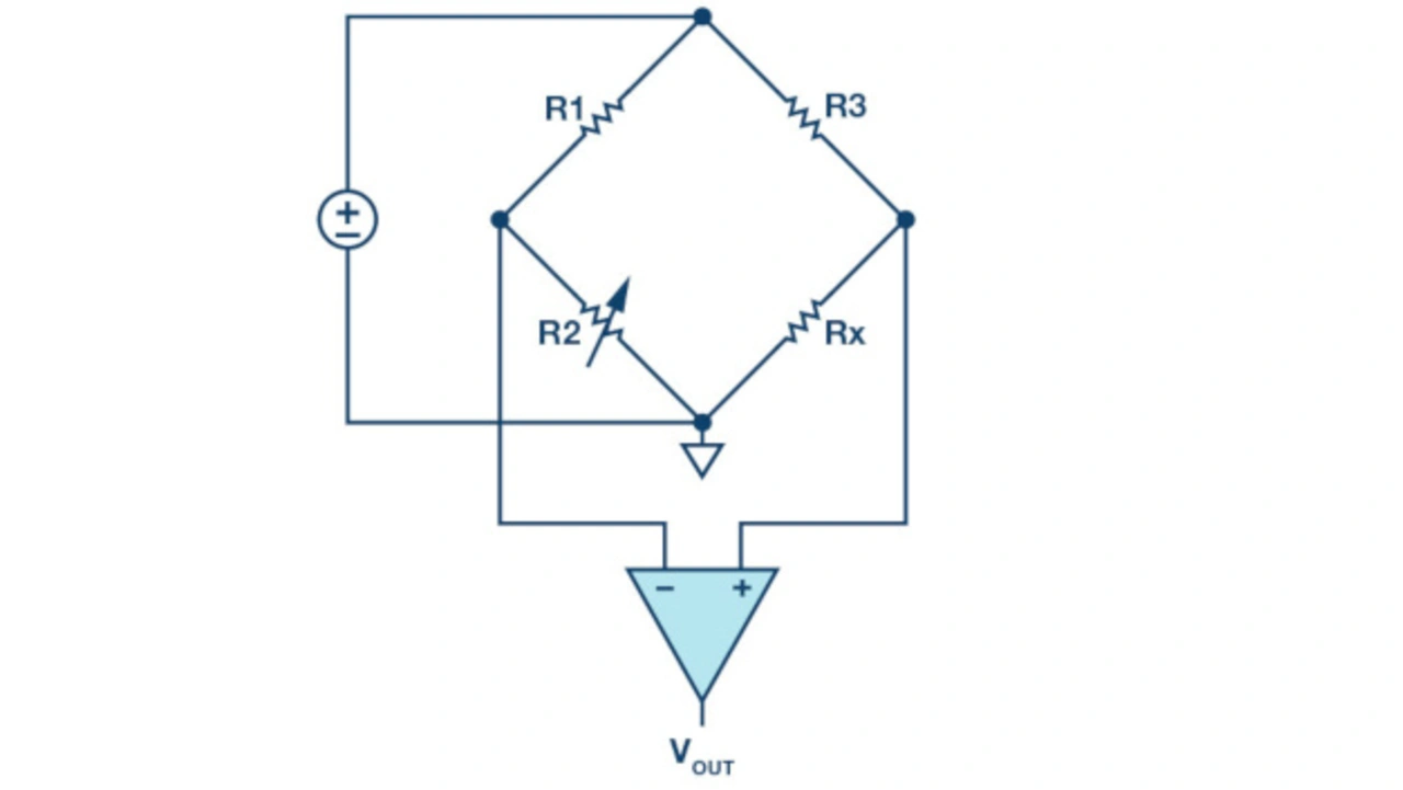 Der Begriff einer gerichteten Brücke geht auf die Wheatstone-Brücke (Bild 5) zurück: unter Abgleich wird dort keine differenzielle Spannung erzeugt. Die Wheatstone-Brücke hält einen Widerstand veränderlich (R2), die anderen Widerstände (R1, R3, Rx) tragen feste Werte. Der Wert von Rx ist zunächst unbekannt und wird im Abgleich bestimmt: für R1 = R3 und R2 = Rx verschwindet die Brückenspannung, VOUT = 0 V.